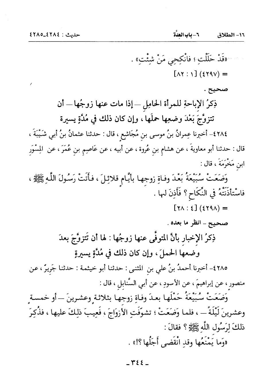 4285 - أَخْبَرَنَا أَحْمَدُ بْنُ عَلِيِّ بْنِ الْمُثَنَّى حَدَّثَنَا أَبُو خَيْثَمَةَ حَدَّثَنَا جَرِيرٌ عَنْ مَنْصُورٍ عَنْ إِبْرَاهِيمَ عَنِ الْأَسْوَدِ عَنْ أَبِي السَّنَابِلِ قَالَ: