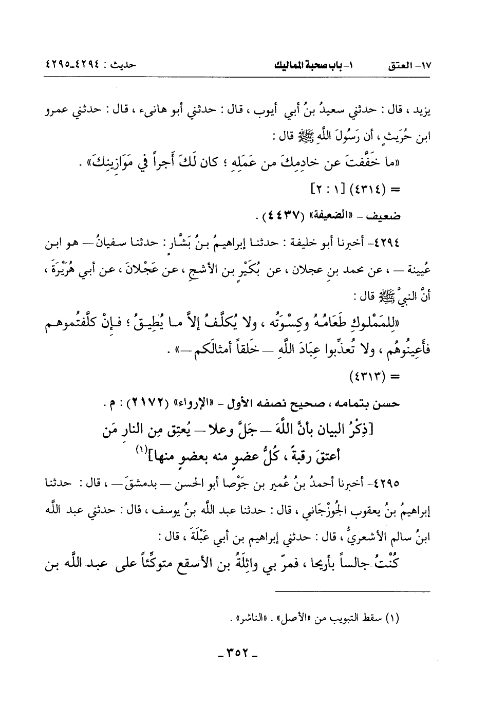 [ذِكْرُ الْبَيَانِ بِأَنَّ اللَّهَ ـ جَلَّ وَعَلَا ـ يُعتِق مِنَ النَّارِ مَنْ أَعْتَقَ رقبةَ كُلُّ عضوٍ منه بعضوٍ منها] (¬1)