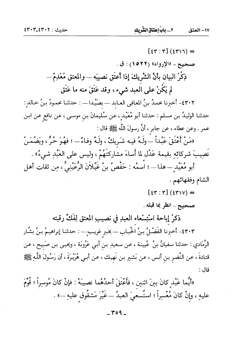 (أَيُّمَا عَبْدٌ كَانَ بَيْنَ اثْنَيْنِ فَأَعْتَقَ أَحَدُهُمَا نَصِيبَهُ فَإِنْ كَانَ مُوسِرًا قُوِّمَ عَلَيْهِ وَإِنْ كَانَ مُعْسِرًا استُسعيَ العبدُ ـ غَيْرَ مشقُوقٍ عليه ـ) -[360]-