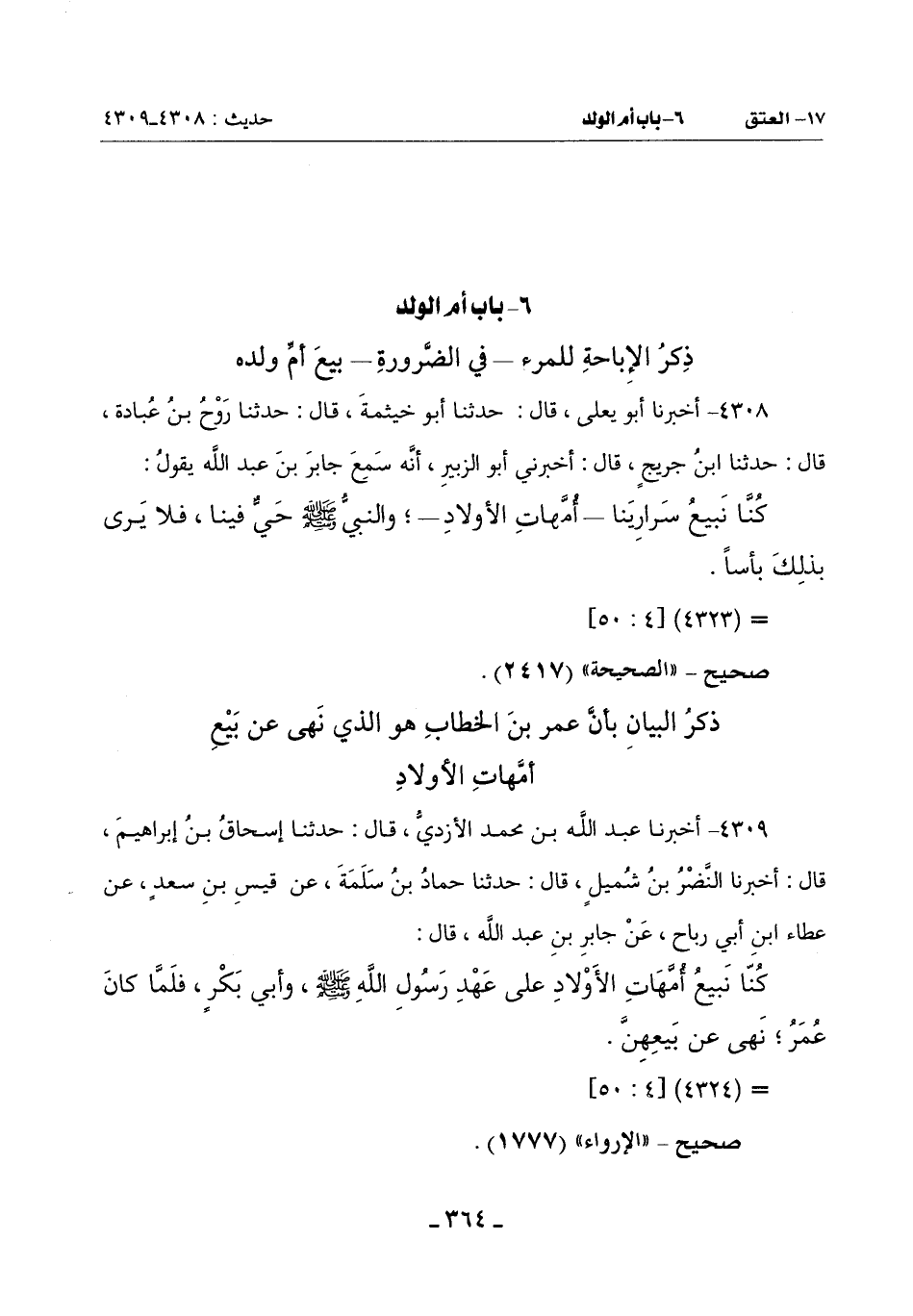 كُنَّا نَبِيعُ سَرَارِينَا ـ أُمَّهَاتِ الْأَوْلَادِ ـ وَالنَّبِيُّ صَلَّى اللَّهُ عَلَيْهِ وَسَلَّمَ حَيٌّ فِينَا فَلَا يَرى بذلِكَ بأساً