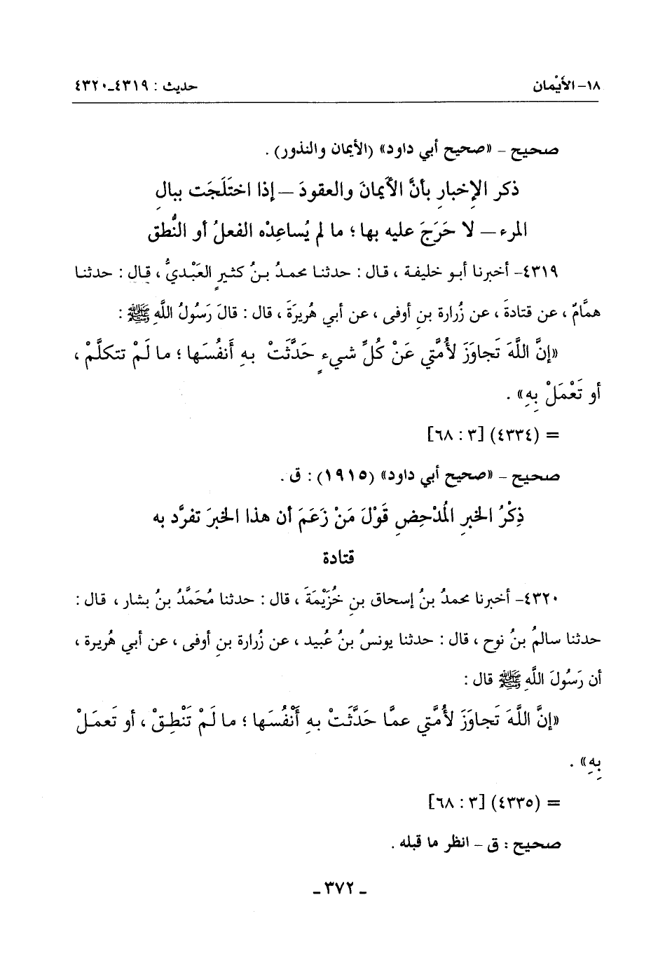 (إِنَّ اللَّهَ تَجَاوَزَ لِأُمَّتِي عَنْ كُلِّ شَيْءٍ حَدَّثَتْ بِهِ أَنْفُسَهَا مَا لَمْ تتكلَّم أو تعمل به)