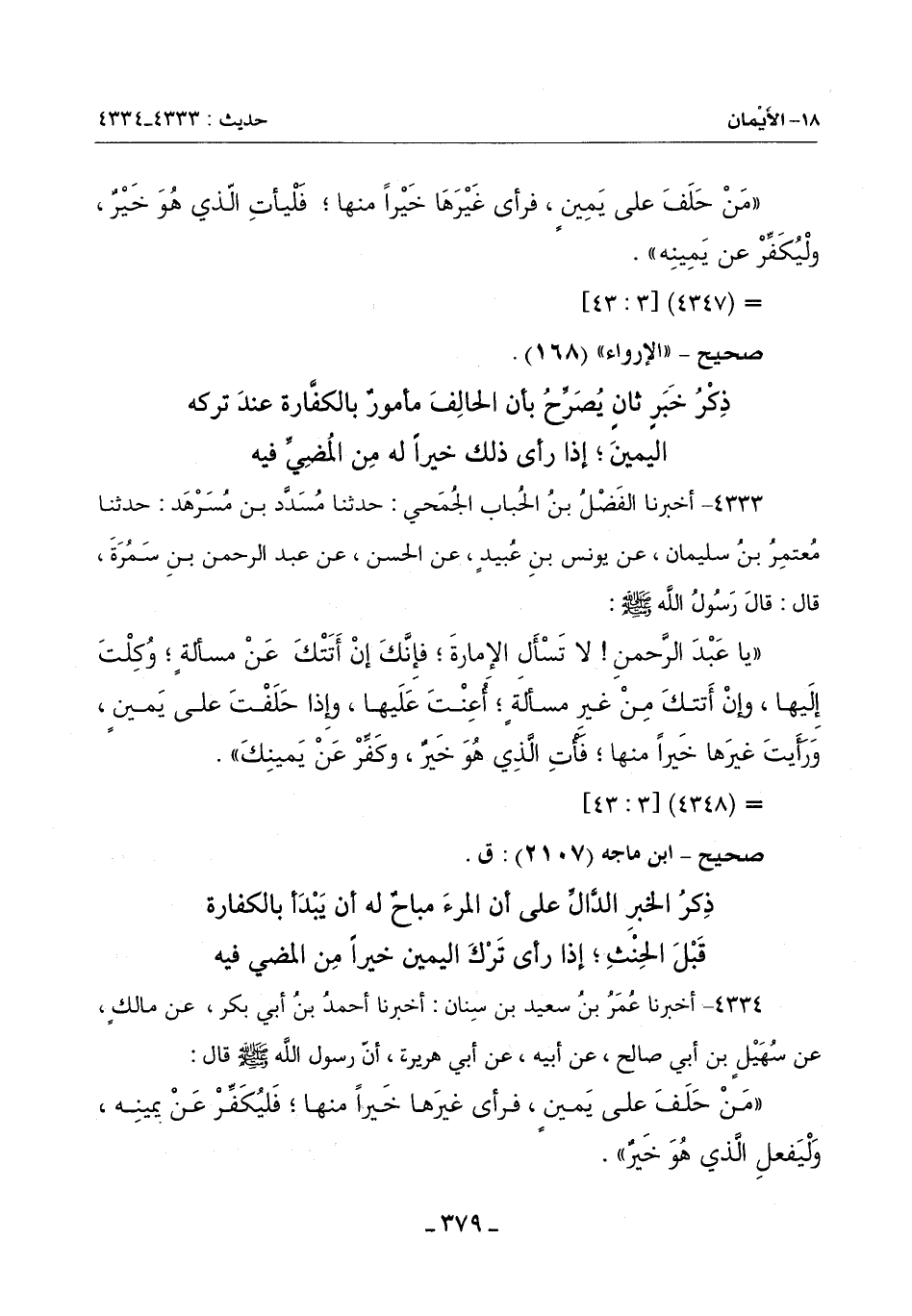 4333 - أَخْبَرَنَا الْفَضْلُ بْنُ الْحُبَابِ الْجُمَحِيُّ حَدَّثَنَا مُسَدَّدُ بْنُ مُسَرْهَدٍ حَدَّثَنَا مُعْتَمِرُ بْنُ سُلَيْمَانَ عَنْ يُونُسَ بْنِ عُبَيْدٍ عَنِ الْحَسَنِ عَنْ عبد الرَّحْمَنِ بْنِ سَمُرَةَ قَالَ: قَالَ رَسُولُ اللَّهِ صَلَّى اللَّهُ عَلَيْهِ وَسَلَّمَ: