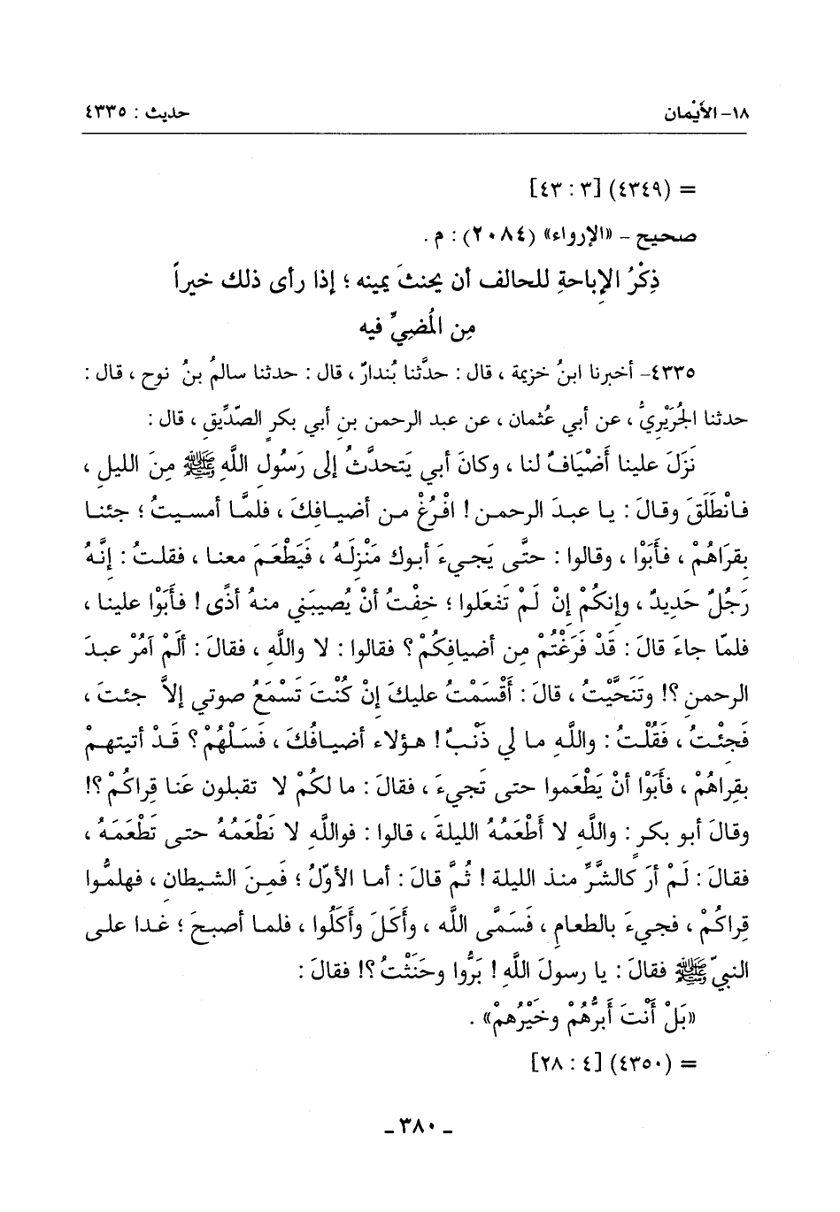 نَزَلَ عَلَيْنَا أَضْيَافٌ لَنَا وَكَانَ أَبِي يَتَحَدَّثُ إِلَى رَسُولِ اللَّهِ صَلَّى اللَّهُ عَلَيْهِ وَسَلَّمَ مِنَ اللَّيْلِ فَانْطَلَقَ وَقَالَ: يَا عَبْدَ الرَّحْمَنِ افْرُغْ مِنْ أَضْيَافِكَ فَلَمَّا أَمْسَيْتُ جِئْنَا بِقرَاهُمْ فأَبَوْا وَقَالُوا: حَتَّى يَجِيءَ أَبُوكَ مَنْزِلَهُ فَيَطْعَمُ مَعَنَا فَقُلْتُ: إِنَّهُ رَجُلٌ حَدِيدٌ وَإِنَّكُمْ إِنْ لَمْ تَفْعَلُوا خِفْتُ أَنْ يُصِيبَنِي مِنْهُ أَذًى فَأَبَوْا عَلَيْنَا فَلَمَّا جَاءَ قَالَ: قَدْ فَرَغْتُمْ مِنْ أَضْيَافِكُمْ؟ فَقَالُوا: لَا وَاللَّهِ فَقَالَ: أَلَمْ آمُرُ عَبْدَ الرَّحْمَنِ وتنحَّيت قَالَ: أَقْسَمْتُ عَلَيْكَ إِنْ كُنْتَ تَسْمَعُ صَوْتِي إِلَّا جِئْتَ فَجِئْتُ فَقُلْتُ: وَاللَّهِ مَا لِي ذَنْبٌ هَؤُلَاءِ أَضْيَافُكَ فَسَلْهُمْ؟ قَدْ أَتَيْتُهُمْ بِقِرَاهُمْ فَأَبَوْا أَنْ يَطْعَمُوا حَتَّى تَجِيءَ فَقَالَ: مَا لَكُمْ لَا تَقْبَلُونَ عَنَّا قِراكُمْ؟ وَقَالَ أَبُو بَكْرٍ: وَاللَّهِ لَا أَطْعَمُهُ اللَّيْلَةَ قَالُوا: فَوَاللَّهِ لَا نَطْعَمُهُ حَتَّى تَطْعَمَهُ فَقَالَ: لَمْ أَرْ كالشَّرِّ مُنْذُ اللَّيْلَةِ ثُمَّ قَالَ: أَمَّا الْأَوَّلُ فَمِنِ الشَّيْطَانِ فهلمُّوا قِرَاكُمْ فَجِيءَ بِالطَّعَامِ فَسَمَّى اللَّهَ وَأَكَلَ وَأَكَلُوا فَلَمَّا أَصْبَحَ غَدَا عَلَى النَّبِيِّ صَلَّى اللَّهُ عَلَيْهِ وَسَلَّمَ فَقَالَ: يَا رَسُولَ اللَّهِ بَرُّوا وحَنَثْتُ فَقَالَ: