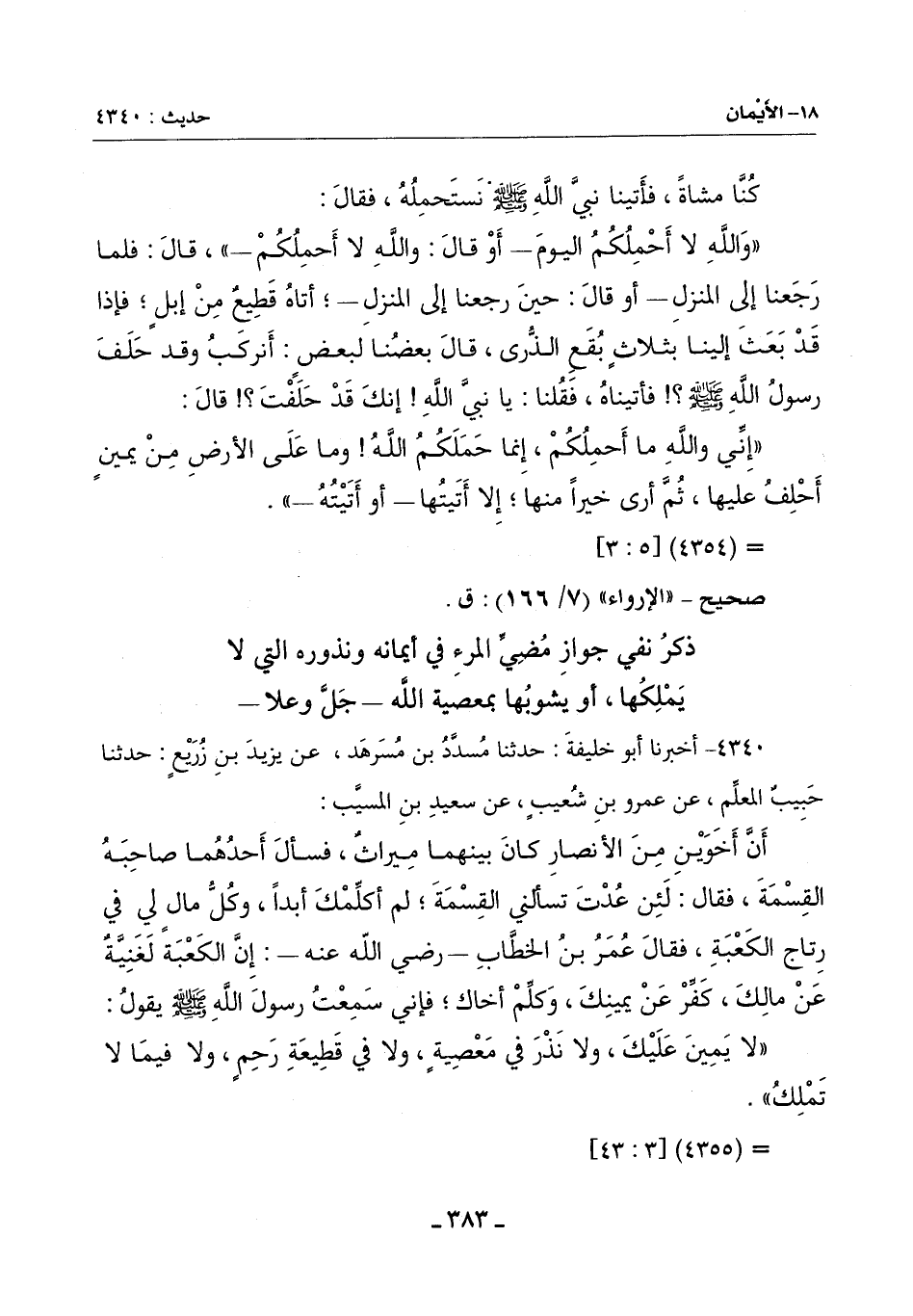 أَنَّ أَخَوَيْنِ مِنَ الْأَنْصَارِ كَانَ بَيْنَهُمَا مِيرَاثٌ فَسَأَلَ أَحَدُهُمَا صَاحِبَهُ الْقِسْمَةَ فَقَالَ لَئِنْ عُدْتَ تَسْأَلُنِي الْقِسْمَةَ لَمْ أُكَلِّمْكَ أَبَدًا وكُلُّ مالٍ لِي فِي رِتَاجِ الْكَعْبَةِ فَقَالَ عُمَرُ بْنُ الْخَطَّابِ رَضِيَ اللَّهُ عَنْهُ: إِنَّ الْكَعْبَةَ لَغَنِيَّةٌ عَنْ مَالِكَ كفِّر عَنْ يَمِينِكِ وكلِّم أَخَاكَ فَإِنِّي سَمِعْتُ رَسُولَ اللَّهِ صَلَّى اللَّهُ عَلَيْهِ وَسَلَّمَ يَقُولُ: