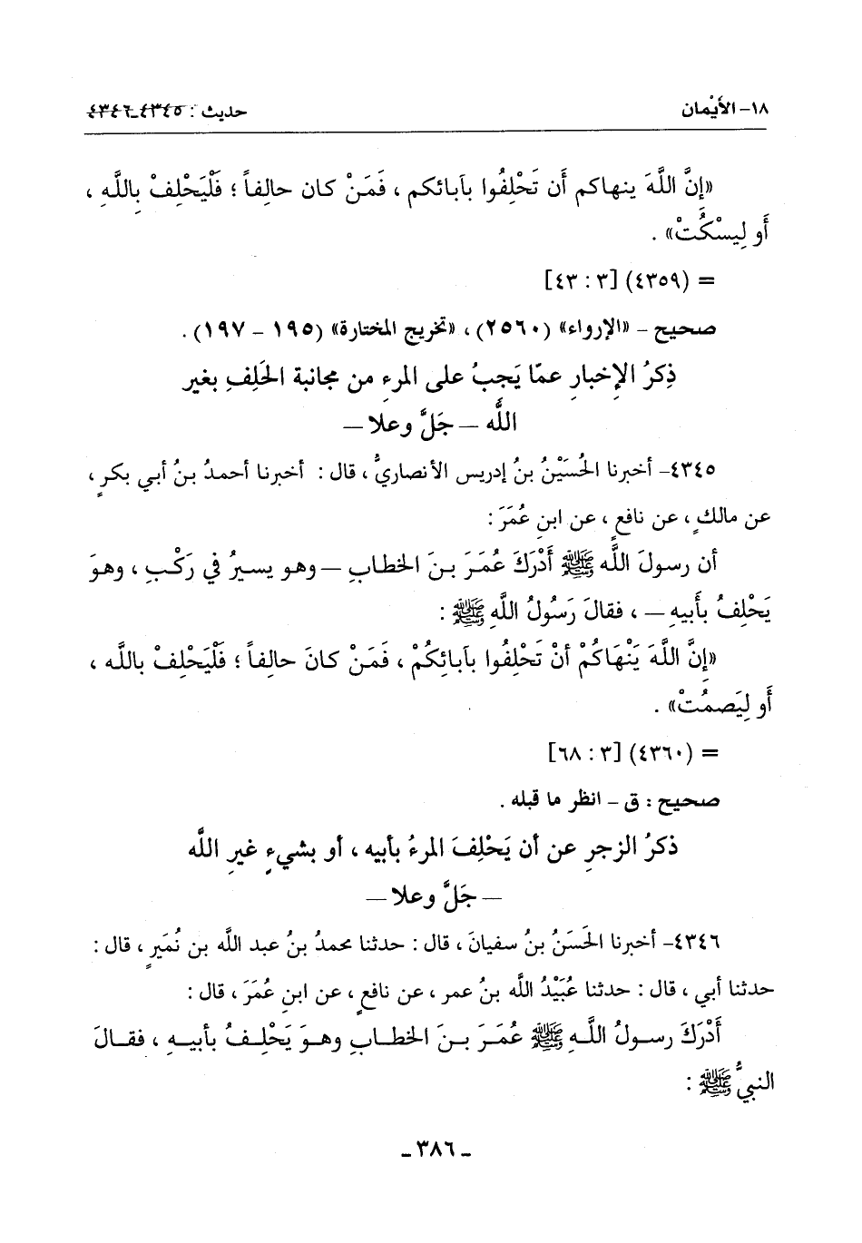 4346 - أَخْبَرَنَا الْحَسَنُ بْنُ سُفْيَانَ قَالَ: حَدَّثَنَا مُحَمَّدُ بْنُ عَبْدِ اللَّهِ بْنِ نُمَيْرٍ قَالَ: حَدَّثَنَا أَبِي قَالَ: حَدَّثَنَا عُبَيْدُ اللَّهِ بْنُ عُمَرَ عَنْ نَافِعٍ عَنِ ابْنِ عُمَرَ قَالَ: