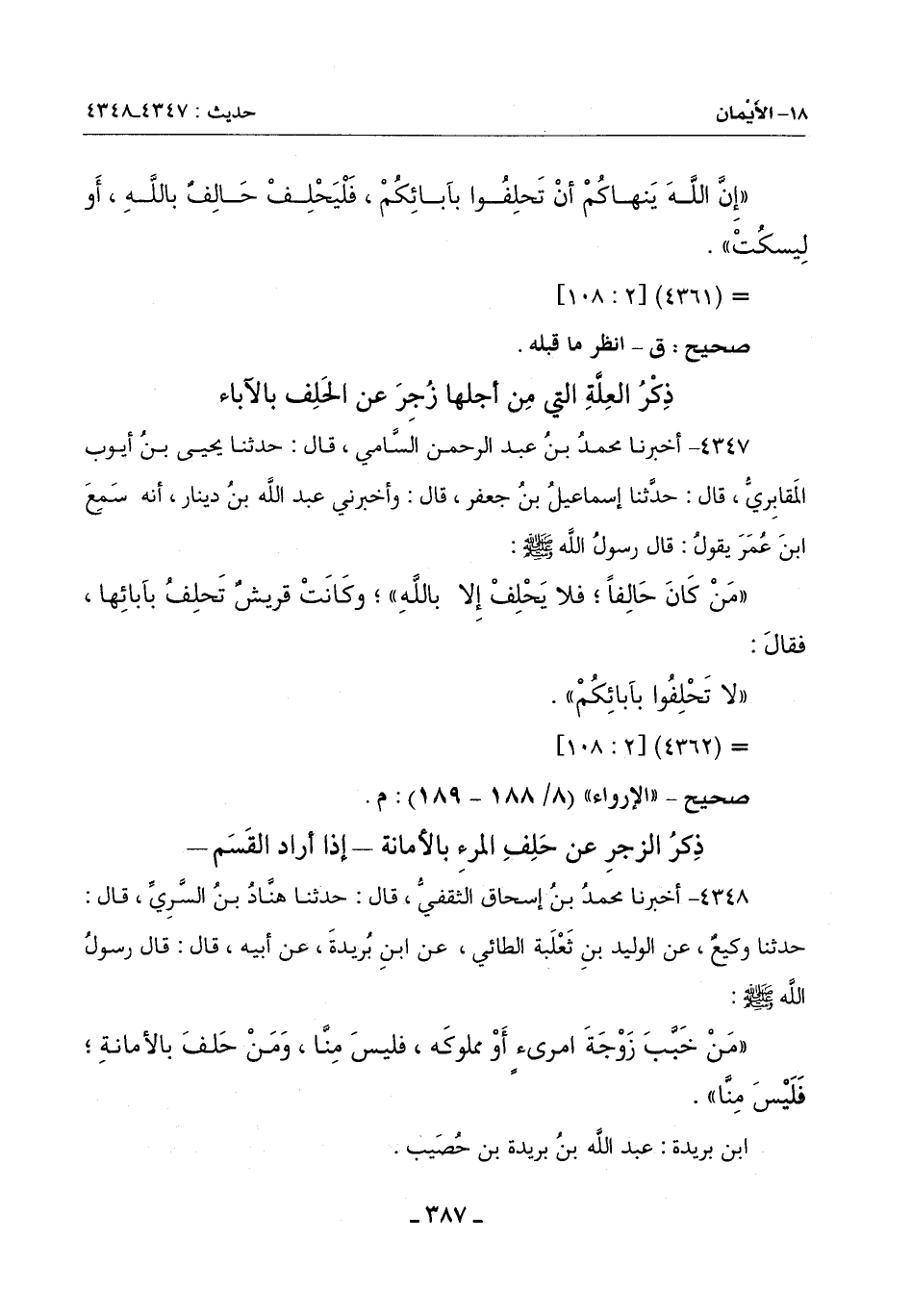 4347 - أخبرنا محمد بن مُحَمَّدُ بْنُ عَبْدِ الرَّحْمَنِ السَّامِيُّ قَالَ: حَدَّثَنَا يَحْيَى بْنُ أَيُّوبَ الْمَقَابِرِيُّ قَالَ: حَدَّثَنَا إِسْمَاعِيلُ بْنُ جَعْفَرٍ قَالَ: وَأَخْبَرَنِي عَبْدُ اللَّهِ بْنُ دِينَارٍ أَنَّهُ سَمِعَ ابْنَ عُمَرَ يَقُولُ: قَالَ رَسُولُ الله صلى الله عليه وسلم:
