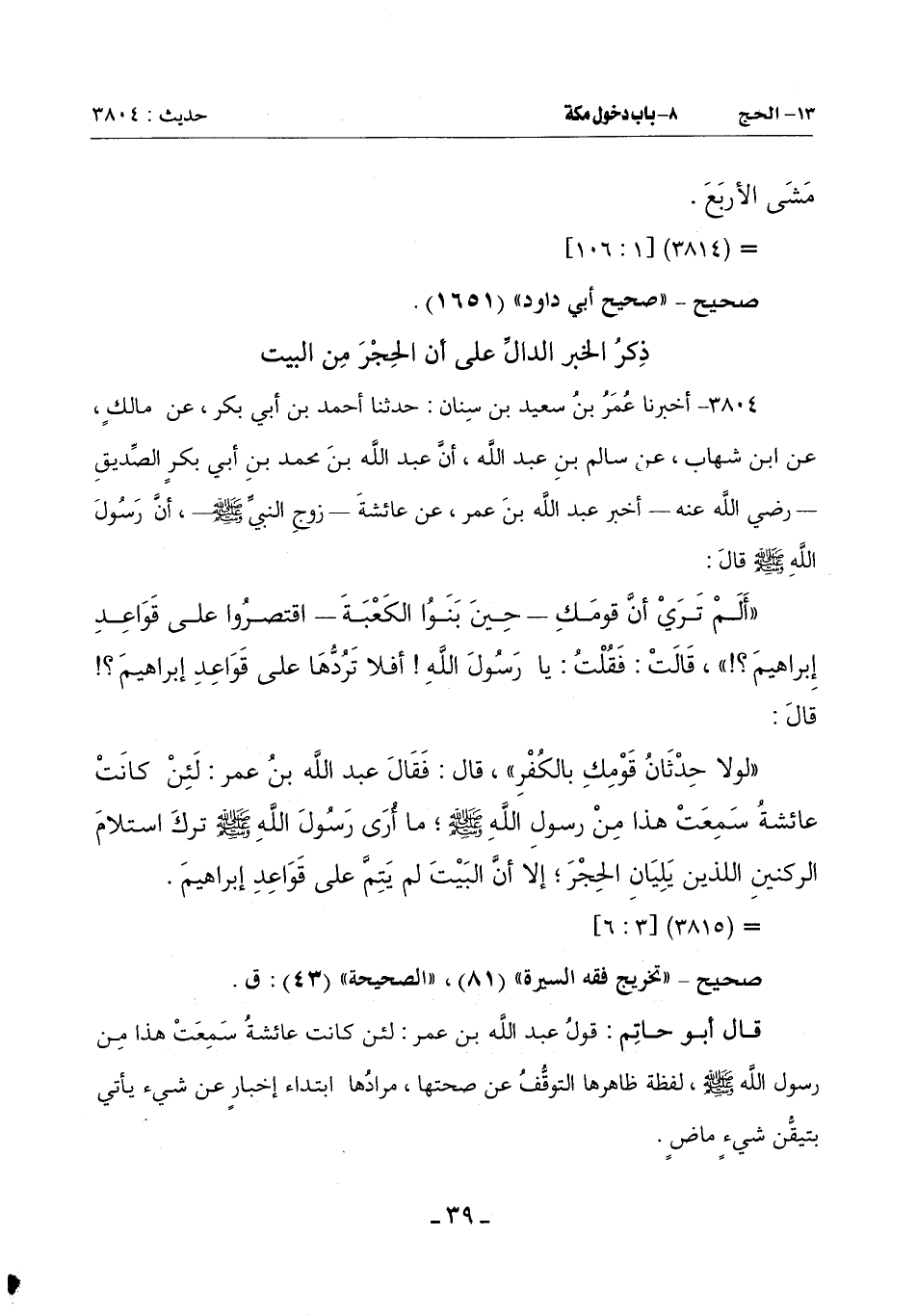 (أَلَمْ تَرَيْ أَنَّ قَوْمَكِ ـ حِينَ بَنَوَا الْكَعْبَةَ ـ اقْتَصَرُوا عَلَى قَوَاعِدِ إِبْرَاهِيمَ) قَالَتْ: فَقُلْتُ: يَا رَسُولَ اللَّهِ أَفَلَا تَرُدُّهَا عَلَى قَوَاعِدِ إِبْرَاهِيمَ؟ قَالَ: