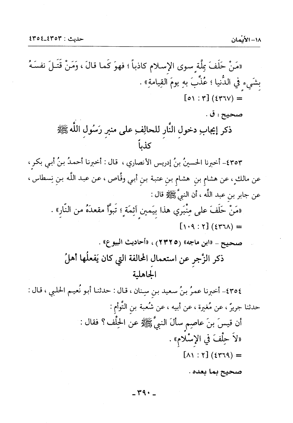 (مَنْ حَلَفَ عَلَى مِنْبَرِي هَذَا بِيَمِينٍ آثمةٍ تَبوَّأ مقعدَهُ من النار)