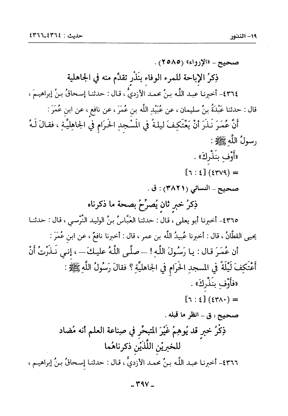 4364 - أَخْبَرَنَا عَبْدُ اللَّهِ بْنُ مُحَمَّدٍ الْأَزْدِيُّ قَالَ: حَدَّثَنَا إِسْحَاقُ بْنُ إِبْرَاهِيمَ قَالَ: حَدَّثَنَا عَبْدَةُ بْنُ سُلَيْمَانَ عَنْ عُبَيْدِ اللَّهِ بْنِ عُمَرَ عَنْ نَافِعٍ عَنِ ابْنِ عُمَرَ: