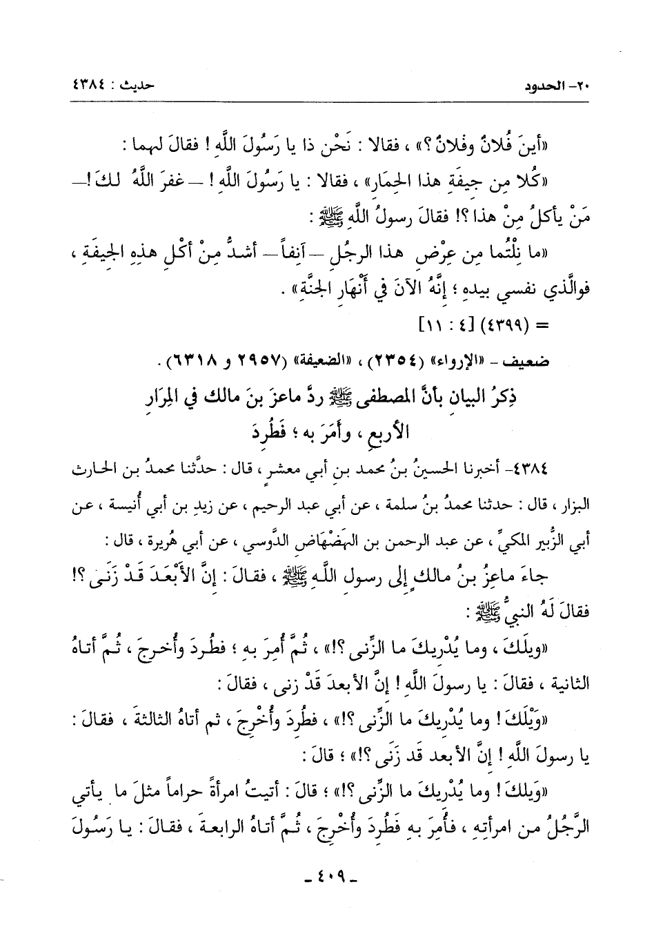 (أَدْخَلْتَ وأَخْرَجْتَ؟ ) قَالَ: نَعَمْ فأُمِرَ بِهِ أَنْ يُرجَمَ فَلَمَّا وَجَدَ مسَّ الْحِجَارَةِ تحمَّل إِلَى شَجَرَةٍ فرُجِمَ عِنْدَهَا حَتَّى مَاتَ فمرَّ رَسُولُ اللَّهِ صَلَّى اللَّهُ عَلَيْهِ وَسَلَّمَ ـ بَعْدَ ذَلِكَ مَعَهُ نَفَرٌ مِنْ أَصْحَابِهِ ـ فَقَالَ رَجُلٌ مِنْهُمْ لِصَاحِبِهِ: وَأبِيكَ إِنَّ هَذَا لَهُوَ الخائِبُ أَتَى النَّبِيَّ صَلَّى اللَّهُ عَلَيْهِ وَسَلَّمَ مراراًُ كُلُّ ذَلِكَ يردُّهُ حَتَّى قُتِلَ كَمَا يُقْتَلُ الْكَلْبُ فَسَكَتَ عَنْهُمَا النَّبِيُّ صَلَّى اللَّهُ عَلَيْهِ وَسَلَّمَ حَتَّى مَرَّ بِجِيفَةِ حِمَارٍ شَائِلَةٌ رِجْلُهَا فَقَالَ: