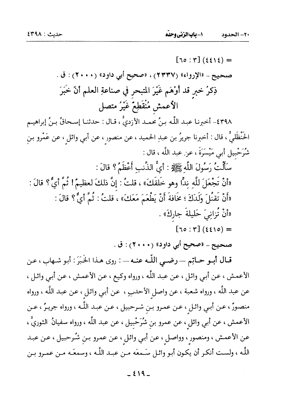قَالَ أَبُو حَاتِمٍ رَضِيَ اللَّهُ عَنْهُ: رَوَى هَذَا الْخَبَرَ أَبُو شِهَابٍ عَنِ الْأَعْمَشِ عَنْ أَبِي وَائِلٍ عَنْ عَبْدِ اللَّهِ وَرَوَاهُ وَكِيعٌ عَنِ الْأَعْمَشِ عَنْ أَبِي وَائِلٍ عَنْ عَبْدِ اللَّهِ وَرَوَاهُ شُعْبَةُ عَنْ وَاصِلٍ الْأَحْدَبِ عَنْ أَبِي وَائِلٍ عَنْ عَبْدِ اللَّهِ وَرَوَاهُ مَنْصُورٌ عَنْ أَبِي وَائِلٍ عَنْ عَمْرِو بْنِ شُرَحْبِيلَ عَنْ عَبْدِ اللَّهِ وَرَوَاهُ جَرِيرٌ عَنِ الْأَعْمَشِ عَنْ أَبِي وَائِلٍ عَنْ عَمْرِو بْنِ شُرَحْبِيلَ عَنْ عَبْدِ اللَّهِ وَرَوَاهُ سُفْيَانُ الثَّوْرِيُّ عَنِ الْأَعْمَشِ وَمَنْصُورٌ وَوَاصِلٌ عَنْ أَبِي وَائِلٍ عَنْ عَمْرِو بْنِ شُرَحْبِيلَ عَنْ عَبْدِ اللَّهِ وَلَسْتُ أُنْكِرُ أَنْ يَكُونَ أَبُو وَائِلٍ سَمِعَهُ مِنْ عَبْدِ اللَّهِ وَسَمِعَهُ مِنْ عَمْرِو بْنِ -[420]- شُرَحْبِيلَ عَنْ عَبْدِ اللَّهِ حَتَّى يَكُونَ الطَّرِيقَانِ جَمِيعًا محفوظين