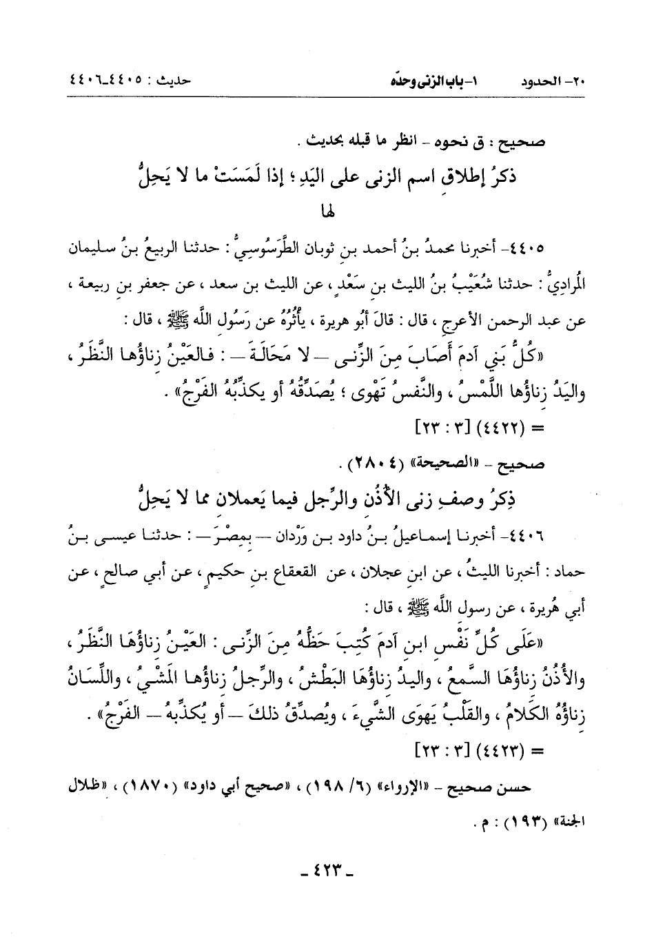 (عَلَى كُلِّ نَفْسِ ابْنِ آدَمَ كُتِبَ حَظُّهُ مِنَ الزِّنَى: الْعَيْنُ زِنَاؤُهَا النَّظَرُ وَالْأُذُنُ زِنَاؤُهَا السَّمْعُ وَالْيَدُ زِنَاؤُهَا الْبَطْشُ وَالرِّجْلُ زِنَاؤُهَا الْمَشْيُ وَاللِّسَانُ زِنَاؤُهُ الْكَلَامُ وَالْقَلْبُ يَهْوَى الشَّيْءَ وَيُصَدِّقُ ذَلِكَ ـ أو يكذبه ـ الفرج)