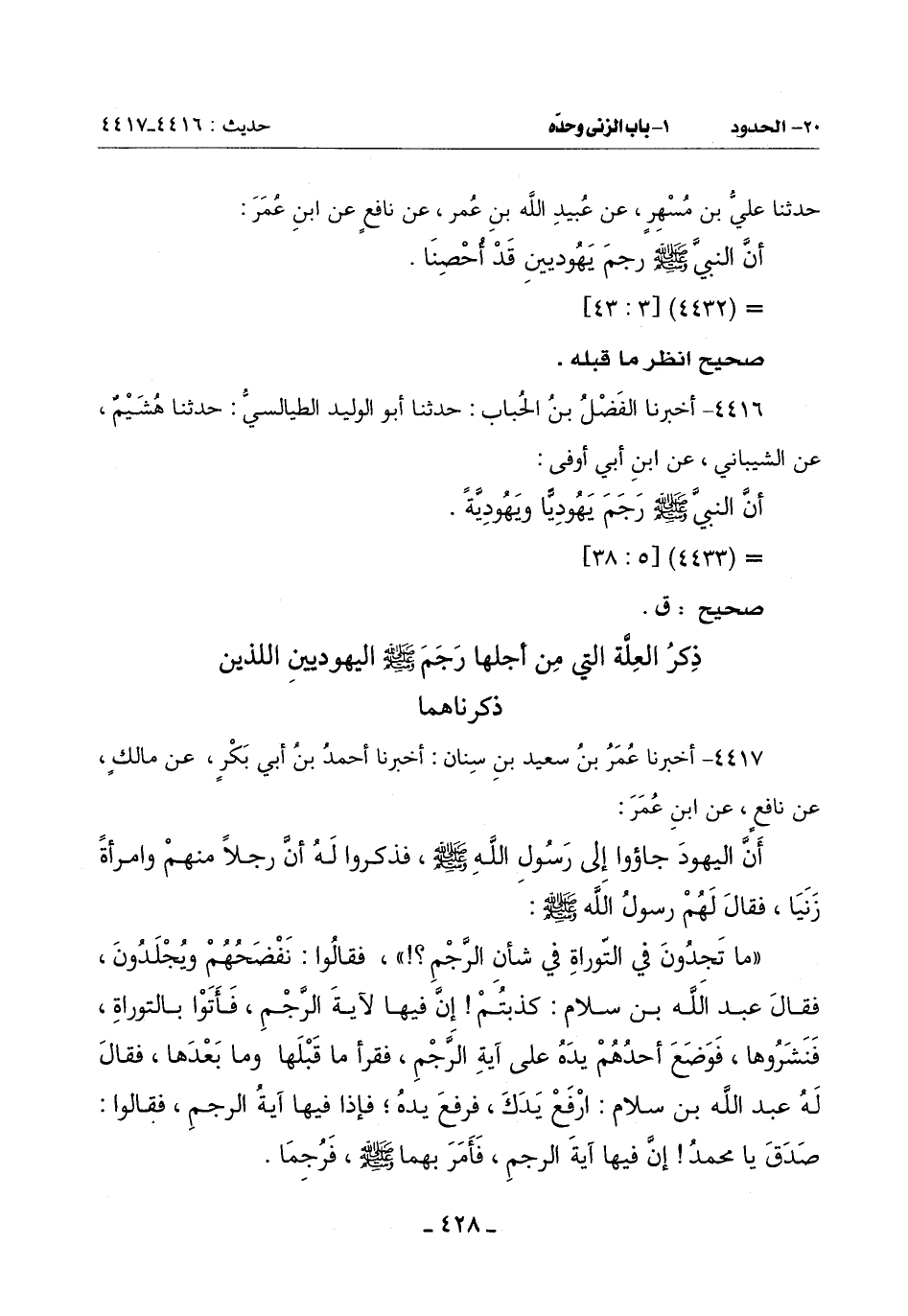 (مَا تَجِدُونَ فِي التَّوْرَاةِ فِي شَأْنِ الرَّجْمِ؟ ) فَقَالُوا: نَفْضَحُهُمْ ويُجْلَدُونَ فَقَالَ عَبْدُ اللَّهِ بْنُ سَلَّامٍ: كَذَبْتُمْ إِنَّ فِيهَا لَآيَةَ الرَّجْمِ فَأَتَوْا بِالتَّوْرَاةِ فَنَشَرُوهَا فَوَضَعَ أَحَدُهُمْ يَدَهُ عَلَى آيَةِ الرَّجْمِ فَقَرَأَ مَا قَبْلَهَا وَمَا بَعْدَهَا فَقَالَ لَهُ عَبْدُ اللَّهِ بْنُ سَلَّامٍ: ارْفَعْ يَدَكَ فَرَفَعَ يَدَهُ فَإِذَا فِيهَا آيَةُ الرَّجْمِ فَقَالُوا: صَدَقَ يَا مُحَمَّدُ إِنَّ فِيهَا آيَةُ الرَّجْمِ فَأَمَرَ بِهِمَا صَلَّى اللَّهُ عَلَيْهِ وَسَلَّمَ فرُجما -[429]-