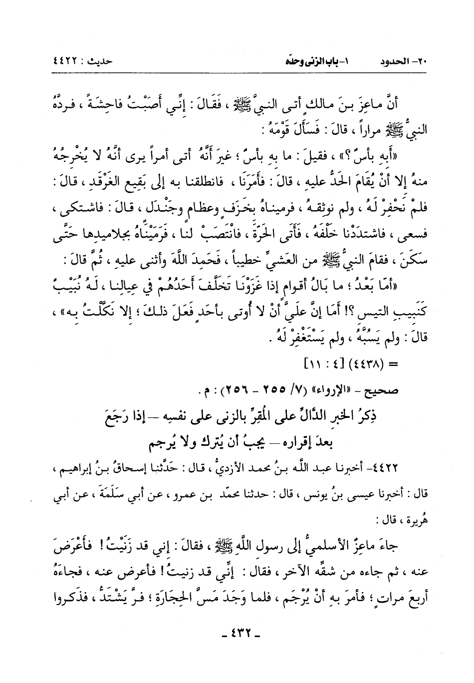 جَاءَ مَاعِزٌ الْأَسْلَمِيُّ إِلَى رَسُولِ اللَّهِ صَلَّى اللَّهُ عَلَيْهِ وَسَلَّمَ فَقَالَ: إِنِّي قَدْ زَنَيْتُ فَأَعْرَضَ عَنْهُ ثُمَّ جَاءَهُ مِنْ شِقِّهِ الْآخَرِ فَقَالَ: إِنِّي قَدْ زَنَيْتُ فَأَعْرَضَ عَنْهُ فَجَاءَهُ أَرْبَعَ مَرَّاتٍ فَأَمَرَ بِهِ أَنْ يُرجم فَلَمَّا وَجَدَ مَسَّ الْحِجَارَةِ فرَّ يشتدُّ فَذَكَرُوا -[433]- فِرَارَهُ لِرَسُولِ اللَّهِ صَلَّى اللَّهُ عَلَيْهِ وَسَلَّمَ حِينَ مَسَّتْهُ الْحِجَارَةُ فَقَالَ رَسُولُ اللَّهِ صَلَّى اللَّهُ عَلَيْهِ وَسَلَّمَ: