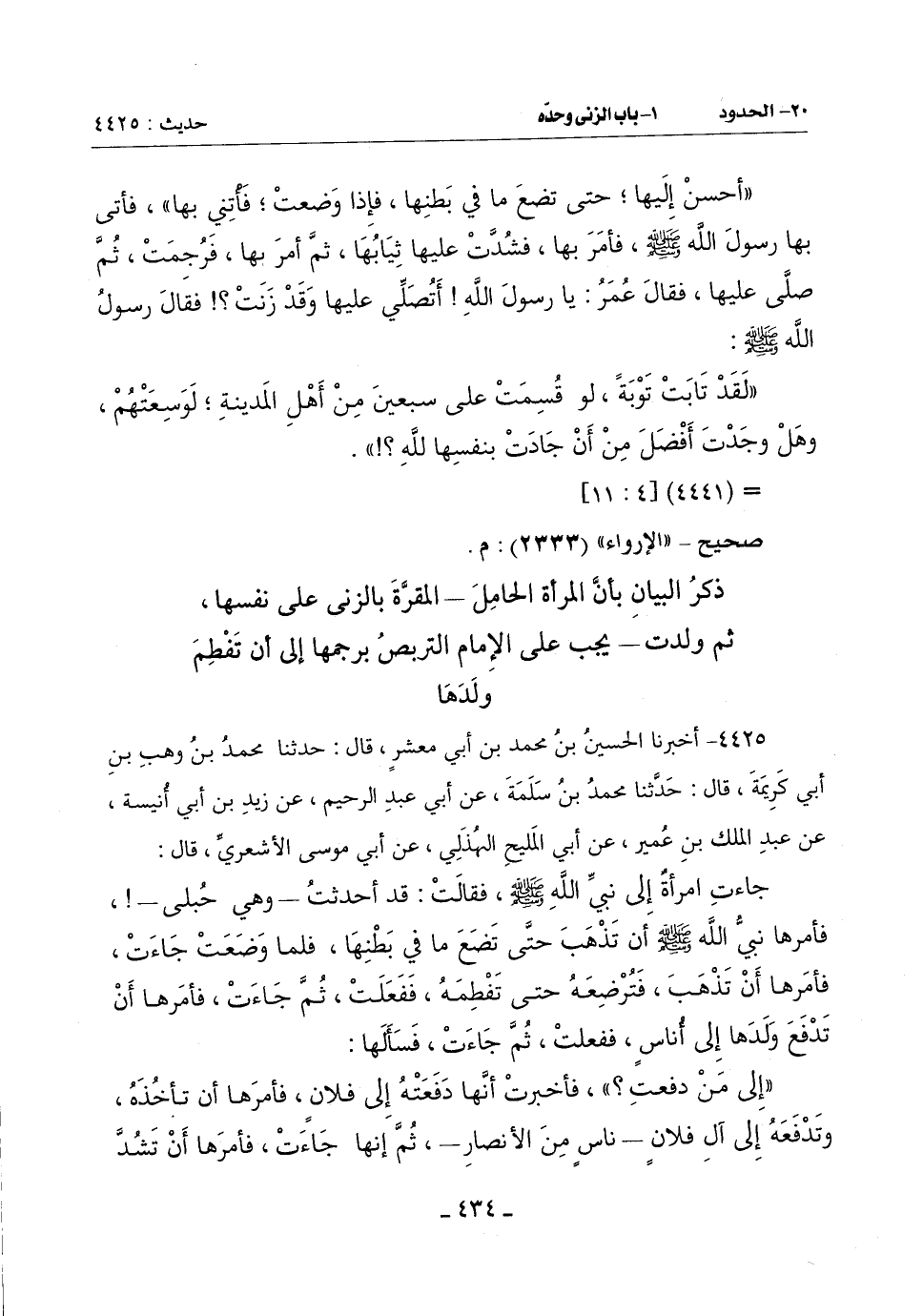 جَاءَتِ امْرَأَةٌ إِلَى نَبِيِّ اللَّهِ صَلَّى اللَّهُ عَلَيْهِ وَسَلَّمَ فَقَالَتْ: قَدْ أحدثتُ وَهِيَ حُبْلَى فَأَمَرَهَا نَبِيُّ اللَّهِ صَلَّى اللَّهُ عَلَيْهِ وَسَلَّمَ أَنْ تَذْهَبَ حَتَّى تَضَعَ مَا فِي بَطْنِهَا فَلَمَّا وَضَعَتْ جَاءَتْ فَأَمَرَهَا أَنْ تَذْهَبَ فتُرضعه حَتَّى تَفْطِمَهُ فَفَعَلَتْ ثُمَّ جَاءَتْ فَأَمَرَهَا أَنْ تَدْفَعَ وَلَدَهَا إِلَى أُنَاسٍ فَفَعَلَتْ ثُمَّ جَاءَتْ فَسَأَلَهَا:
