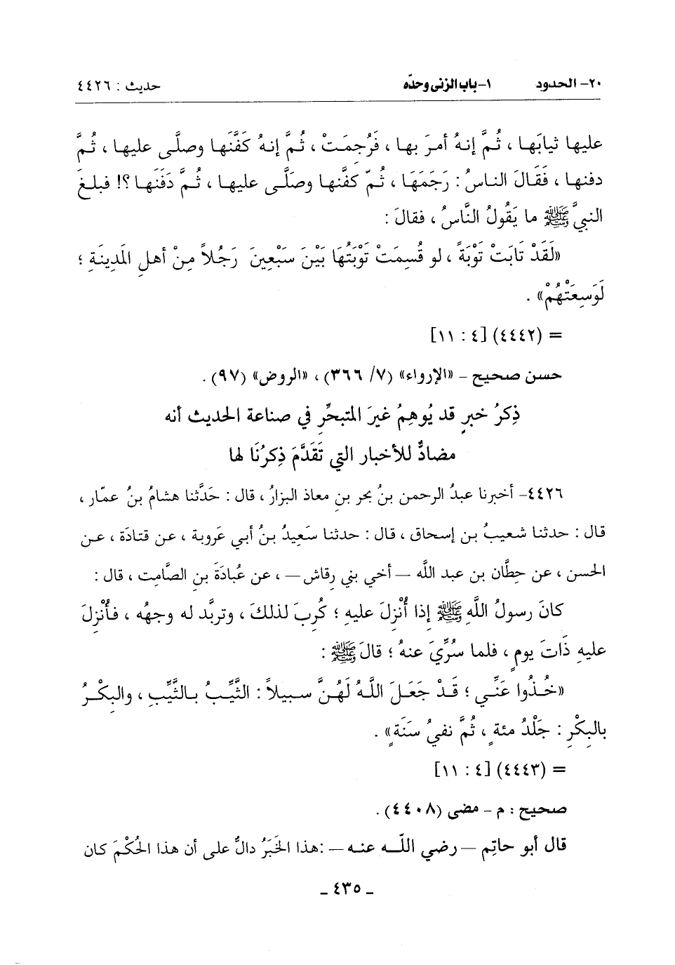 قَالَ أَبُو حَاتِمٍ رَضِيَ اللَّهُ عَنْهُ: هَذَا الْخَبَرُ دَالٌ عَلَى أَنَّ هَذَا الْحُكْمَ كَانَ -[436]- مِنَ اللَّهِ جَلَّ وَعَلَا عَلَى لِسَانِ صفيِّه صَلَّى اللَّهُ عَلَيْهِ وَسَلَّمَ فِي أَوَّلِ مَا أَنْزَلَ حُكْمَ الزَّانِيَيْنِ فَلَمَّا رُفِعَ إِلَيْهِ صَلَّى اللَّهُ عَلَيْهِ وَسَلَّمَ فِي الزِّنَى وَأَقَرَّ مَاعِزُ بْنُ مَالِكٍ وَغَيْرُهُ بِهَا أَمَرَ صَلَّى اللَّهُ عَلَيْهِ وَسَلَّمَ بِرَجْمِهِمْ وَلَمْ يَجْلِدْهُمْ فَذَلِكَ مَا وَصَفْتُ عَلَى أَنَّ هَذَا آخِرُ الْأَمْرَيْنِ مِنَ الْمُصْطَفَى صَلَّى اللَّهُ عَلَيْهِ وَسَلَّمَ وَفِيهِ نَسْخُ الْأَمْرِ بِالْجَلْدِ لِلثَّيِّبَيْنِ وَالِاقْتِصَارُ عَلَى رَجْمِهِمَا