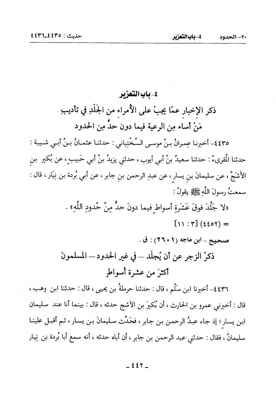 ذِكْرُ الْإِخْبَارِ عَمَّا يَجِبُ عَلَى الْأُمَرَاءِ مِنَ الْجَلْدِ فِي تَأْدِيبِ مَنْ أَسَاءَ مِنَ الرَّعِيَّةِ فِيمَا دُونَ حَدٍّ مِنَ الْحُدُودِ