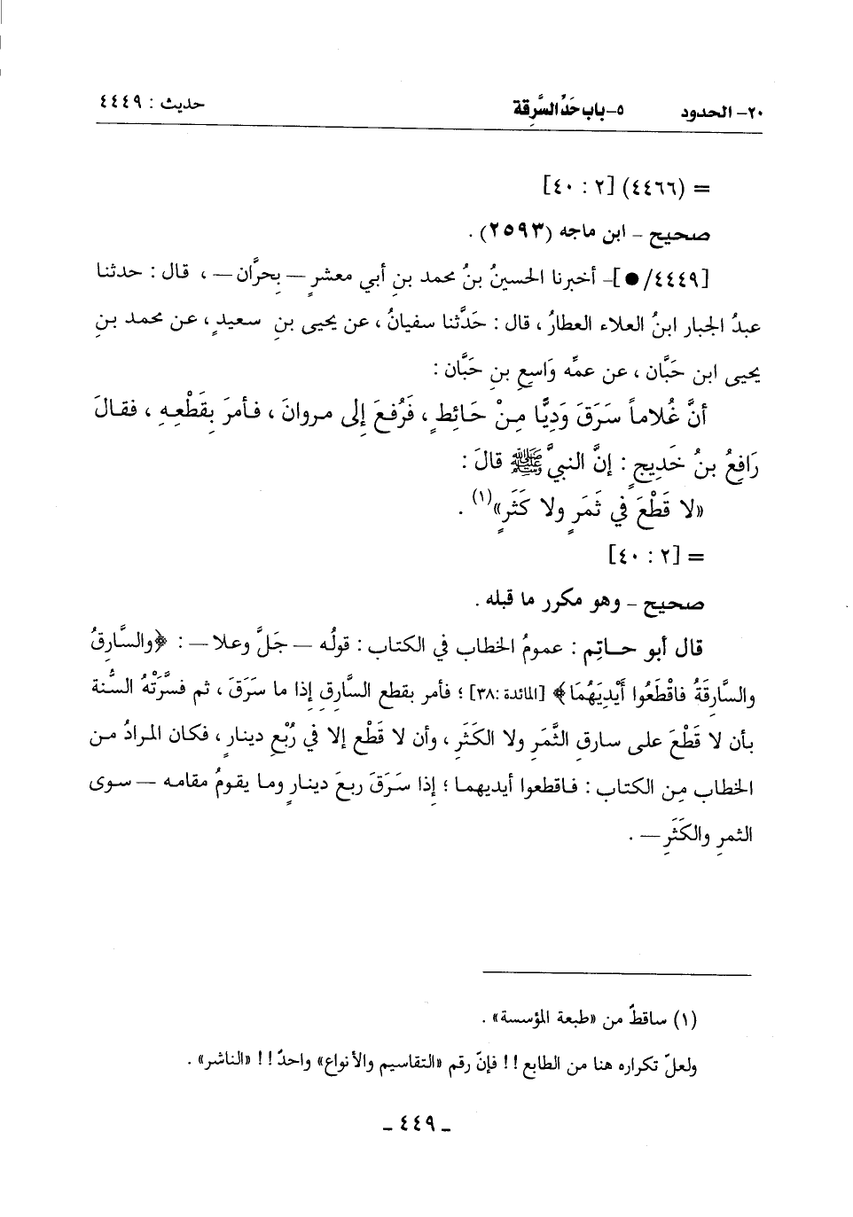 قال أبو حاتم: عموم الخطاب في الكتاب قَوْلُهُ ـ جَلَّ وَعَلَا ـ: {وَالسَّارِقُ وَالسَّارِقَةُ فَاقْطَعُوا أَيْدِيَهُمَا} [المائدة: 38] فَأَمَرَ بِقَطْعِ السَّارِقِ إِذَا مَا سَرَقَ ثُمَّ فسَّرَتْهُ السُّنَّةُ بِأَنْ لَا قَطَعَ عَلَى سَارِقِ الثَّمَرِ وَلَا الكَثَرِ وَأَنْ لَا قَطَعَ فِي رُبْعِ دِينَارٍ فَكَانَ الْمُرَادُ مِنَ الْخِطَابِ مِنَ الْكِتَابِ: فَاقْطَعُوا أَيْدِيَهُمَا إِذَا سَرَقَ رُبُعَ دِينَارٍ وَمَا يَقُومُ مَقَامَهُ ـ سِوَى الثَّمَرِ وَالْكَثَرِ ـ. -[450]-