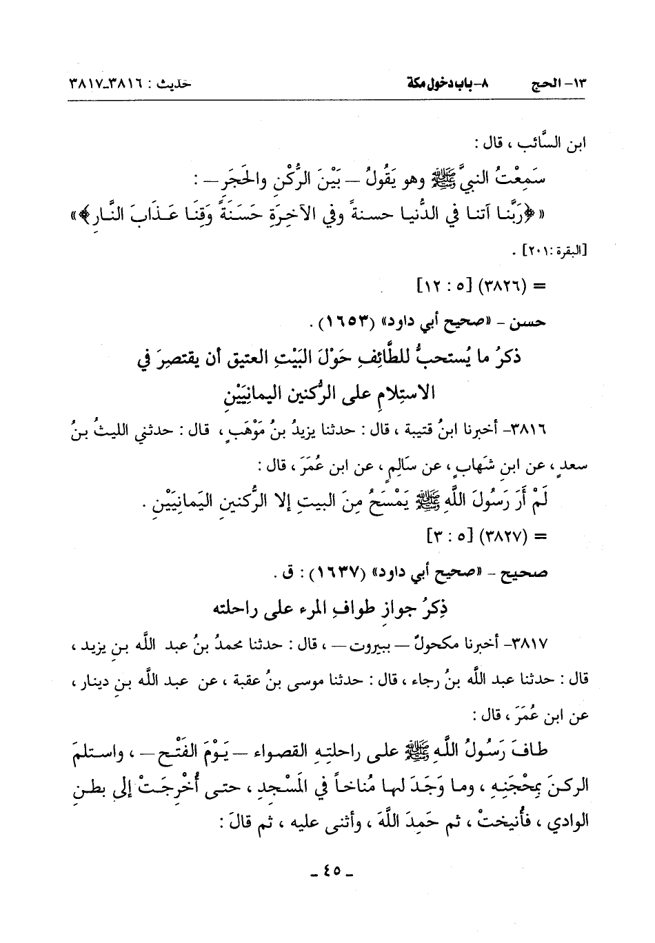 طَافَ رَسُولُ اللَّهِ صَلَّى اللَّهُ عَلَيْهِ وَسَلَّمَ عَلَى رَاحِلَتِهِ الْقَصْوَاءِ يَوْمَ الْفَتْحِ وَاسْتَلَمَ الرُّكْنَ بِمِحْجَنِهِ وَمَا وَجَدَ لَهَا مُناخاً فِي الْمَسْجِدِ حَتَّى أُخْرِجَتْ إِلَى بَطْنِ الْوَادِي فأُنيخت ثُمَّ حَمِدَ اللَّهَ وَأَثْنَى عَلَيْهِ ثُمَّ قَالَ: -[46]-