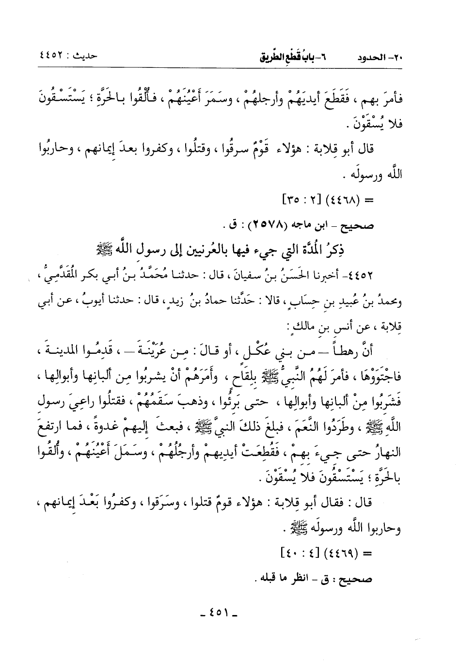 قَالَ: فَقَالَ أَبُو قِلَابَةَ: هَؤُلَاءِ قَوْمٌ قَتَلُوا وَسَرَقُوا وَكَفَرُوا بَعْدَ إِيمَانِهِمْ وَحَارَبُوا اللَّهَ وَرَسُولَهُ صَلَّى اللَّهُ عَلَيْهِ وَسَلَّمَ