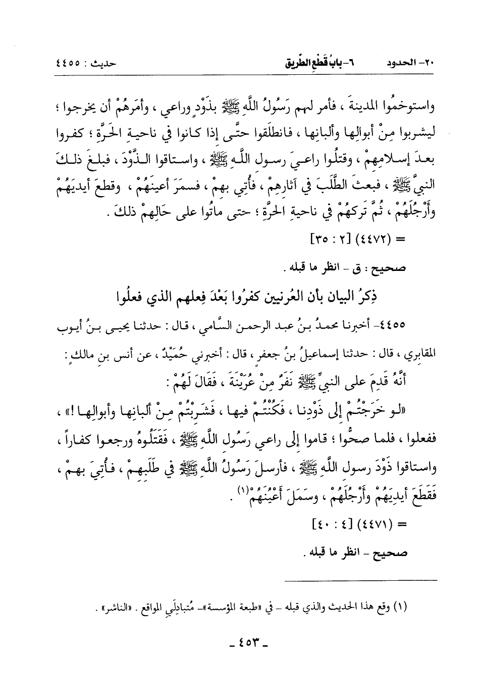 لَوْ خَرَجْتُمْ إِلَى ذَوْدِنَا فَكُنْتُمْ فِيهَا فَشَرِبْتُمْ مِنْ أَلْبَانِهَا وَأَبْوَالِهَا فَفَعَلُوا فَلَمَّا صَحُّوا قَامُوا إِلَى رَاعِي رَسُولِ اللَّهِ صَلَّى اللَّهُ عَلَيْهِ وَسَلَّمَ فَقَتَلُوهُ وَرَجَعُوا كُفَّارًا وَاسْتَاقُوا ذَوْدَ رَسُولِ اللَّهِ صَلَّى اللَّهُ عَلَيْهِ وَسَلَّمَ فَأَرْسَلَ رَسُولُ اللَّهِ صَلَّى اللَّهُ عَلَيْهِ وَسَلَّمَ فِي طَلَبِهِمْ فَأُتِيَ بِهِمْ فَقَطَعَ أَيْدِيهِمْ وَأَرْجُلَهُمْ وسمل أعينهم (¬1).