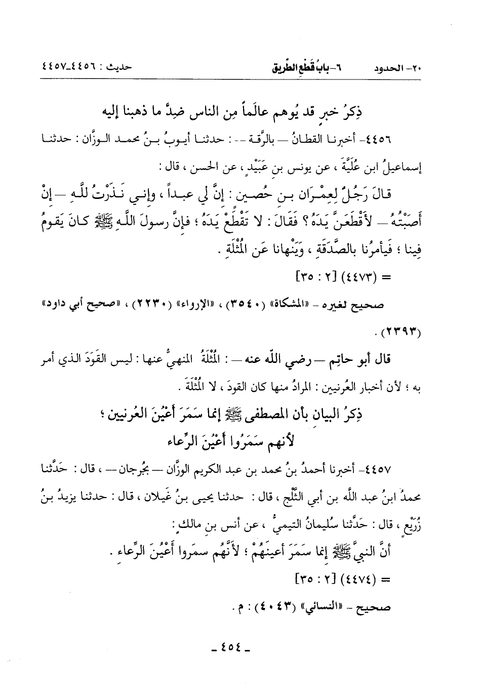 قَالَ أَبُو حَاتِمٍ رَضِيَ اللَّهُ عَنْهُ: المُثْلَةُ المنهيُّ عَنْهَا لَيْسَ القَوَدَ الَّذِي أَمَرَ بِهِ لِأَنَّ أَخْبَارَ العُرنيين الْمُرَادُ مِنْهَا كَانَ الْقَوَدَ لا المثلة