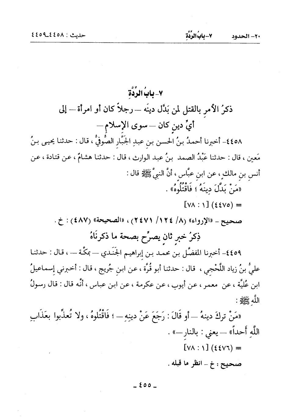 ذِكْرُ الْأَمْرِ بِالْقَتْلِ لِمَنْ بَدَّلَ دِينَهُ رَجُلًا كَانَ أَوِ امْرَأَةً إِلَى أَيِّ دِينٍ كَانَ سوى الإسلام
