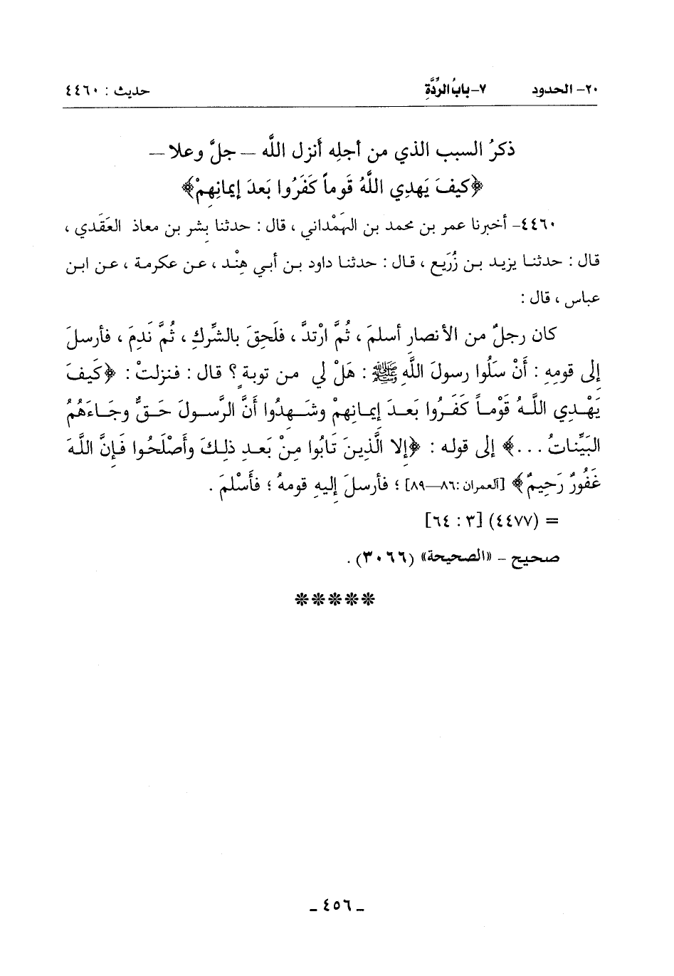 كَانَ رَجُلٌ مِنَ الْأَنْصَارِ أَسْلَمَ ثُمَّ ارْتَدَّ فَلَحِقَ بِالشِّرْكِ ثُمَّ نَدِمَ فَأَرْسَلَ إِلَى قَوْمِهِ: أَنْ سَلُوا رَسُولُ اللَّهِ صَلَّى اللَّهُ عَلَيْهِ وَسَلَّمَ: هَلْ لِي مِنْ تَوْبَةٍ؟ قَالَ: فَنَزَلَتْ {كَيْفَ يَهْدِي اللَّهُ قَوْمًا كَفَرُوا بَعْدَ إِيمَانِهِمْ وَشَهِدُوا أَنَّ الرَّسُولَ حَقٌّ وَجَاءَهُمُ الْبَيِّنَاتُ ... } إِلَى قَوْلِهِ {إِلَّا الَّذِينَ تَابُوا مِنْ بَعْدَ ذَلِكَ وَأَصْلِحُوا فَإِنَّ اللَّهَ غَفُورٌ رَحِيمٌ} [آل عمران: 86 ـ 89] فأرسل إليه قومه؛ فأسلم