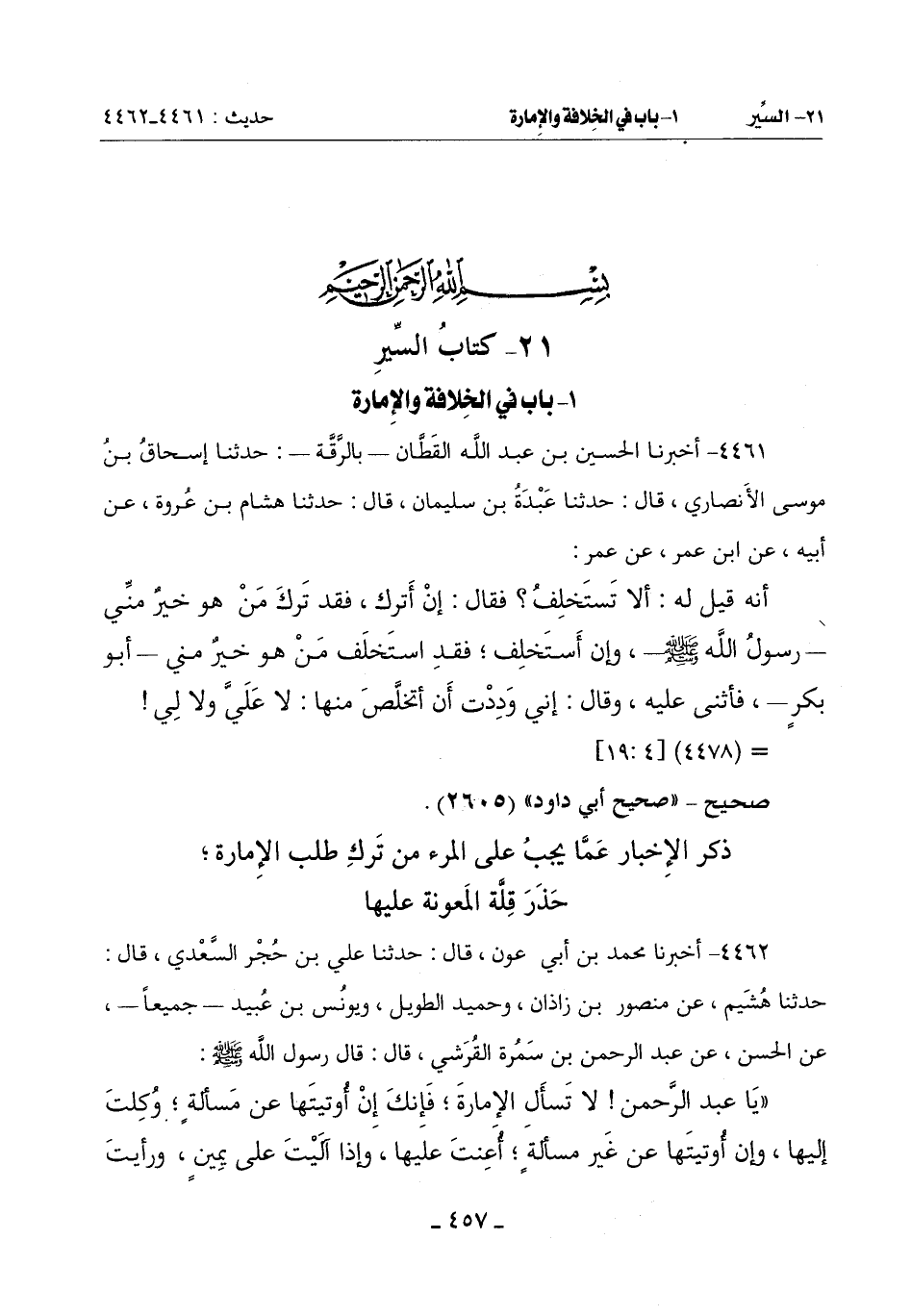 (يَا عَبْدَ الرَّحْمَنِ لَا تَسْأَلِ الْإِمَارَةَ فَإِنَّكَ إِنْ أُوتيتها عَنْ مَسْأَلَةٍ وُكِلتَ إِلَيْهَا وَإِنْ أُوتِيتَهَا عَنْ غَيْرِ مَسْأَلَةٍ أُعِنتَ عَلَيْهَا وَإِذَا آلَيْتَ عَلَى يَمِينٍ وَرَأَيْتَ -[458]- غَيْرَهَا خَيْرًا فَأْتِ الَّذِي هُوَ خير وكفِّر عن يمينك)