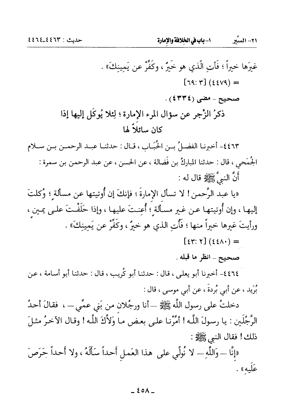(يَا عَبْدَ الرَّحْمَنِ لَا تَسْأَلِ الْإِمَارَةَ فَإِنَّكَ إِنْ أُوتِيتَهَا عَنْ مَسْأَلَةٍ وُكِلْتَ إِلَيْهَا وَإِنْ أُوتِيتَهَا عَنْ غَيْرِ مَسْأَلَةٍ أُعنت عَلَيْهَا وَإِذَا حَلَفْتَ عَلَى يَمِينٍ وَرَأَيْتَ غَيْرَهَا خَيْرًا مِنْهَا فَأْتِ الَّذِي هُوَ خَيْرٌ وكَفِّرْ عن يمينك)