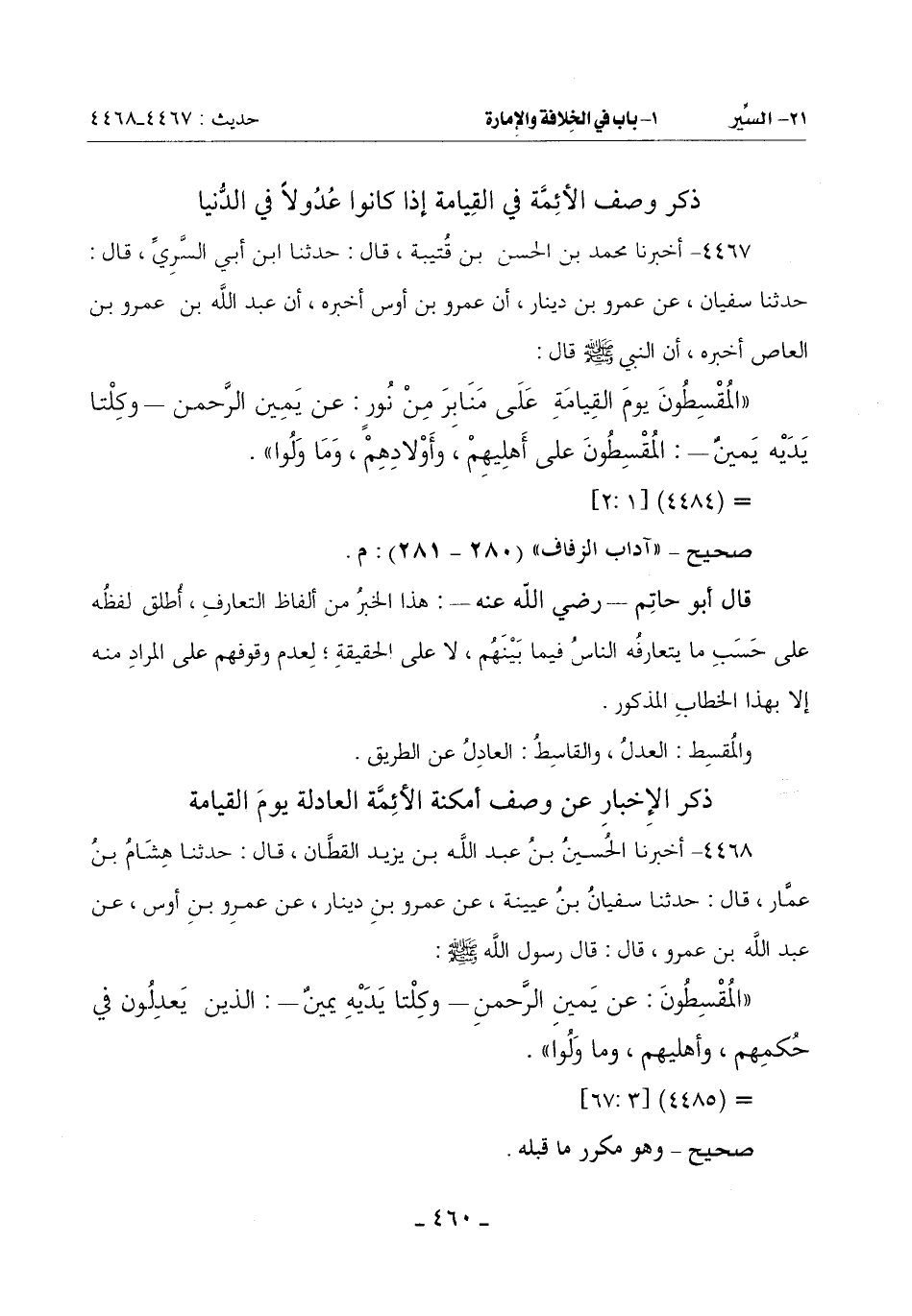 (الْمُقْسِطُونَ عَنْ يَمِينِ الرَّحْمَنِ ـ وَكِلْتَا يَدَيْهِ يَمِينٌ ـ الَّذِينَ يَعْدِلُونَ فِي حكمهم وأهليهم وما ولوا)