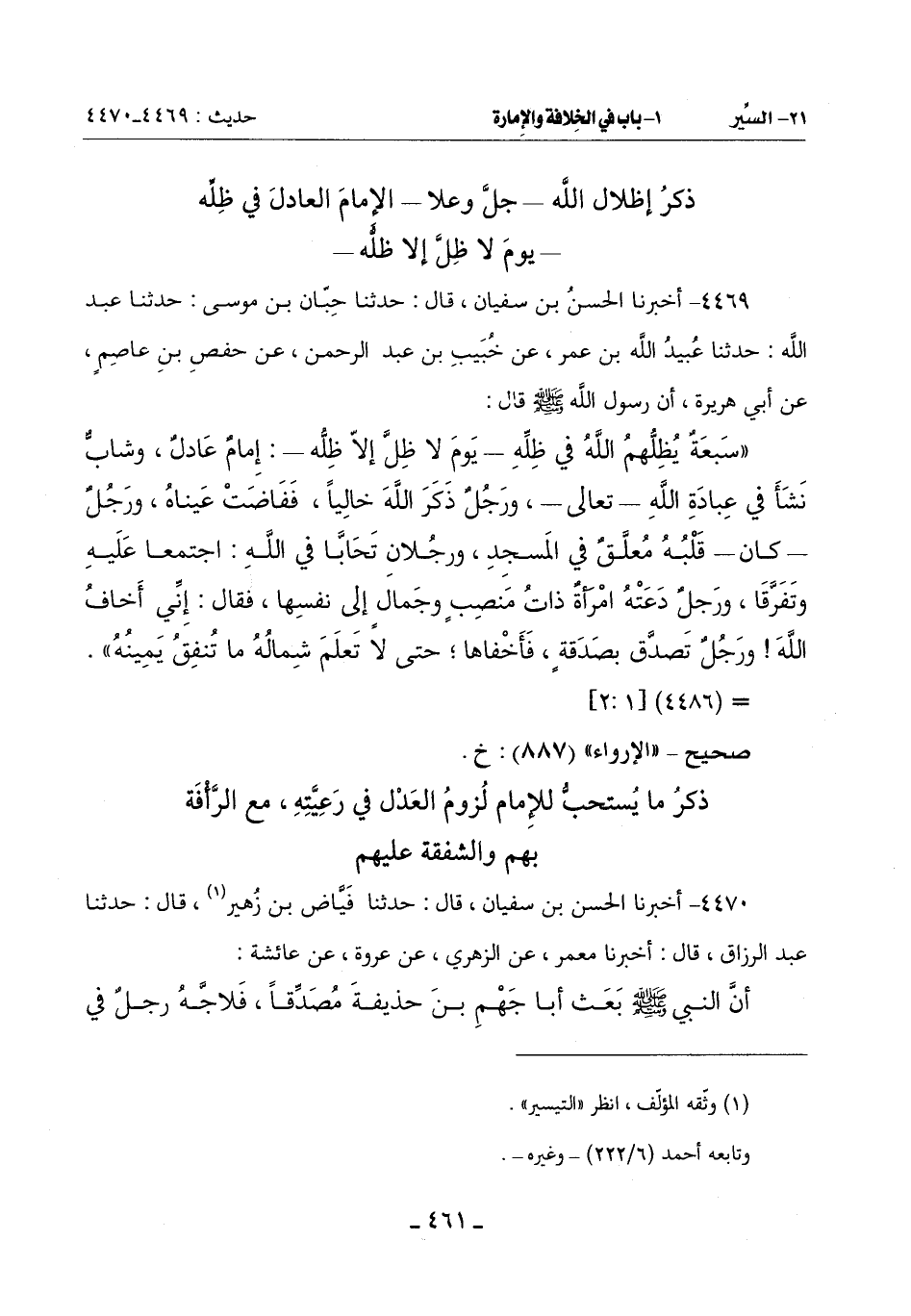 (سَبْعَةٌ يُظِلُّهُمُ اللَّهُ فِي ظِلِّهِ يَوْمَ لَا ظِلَّ إِلَّا ظِلُّهُ: إِمَامٌ عَادِلٌ وَشَابٌّ نَشَأَ فِي عِبَادَةِ اللَّهِ تَعَالَى وَرَجُلٌ ذَكَرَ اللَّهَ خَالِيًا فَفَاضَتْ عَيْنَاهُ وَرَجُلٌ ـ كَانَ ـ قَلْبُهُ مُعَلَّقٌ فِي الْمَسْجِدِ وَرَجُلَانِ تَحَابَّا فِي اللَّهِ: اجْتَمَعَا عَلَيْهِ وَتَفَرَّقَا وَرَجُلٌ دَعَتْهُ امْرَأَةٌ ذَاتَ مَنْصِبٍ وَجَمَالٍ إِلَى نَفْسِهَا فَقَالَ: إِنِّي أَخَافُ اللَّهَ وَرَجُلٌ تَصَدَّقَ بِصَدَقَةٍ فَأَخْفَاهَا حَتَّى لَا تَعْلَمَ شِمَالُهُ مَا تُنْفِقُ يمينه)