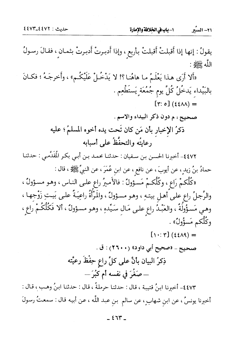 (كُلُّكُمْ رَاعٍ وَكُلُّكُمْ مَسْؤُولٌ عَنْ رَعِيَّتِهِ فَالْإِمَامُ رَاعٍ وَمَسْؤُولٌ عَنْ رَعِيَّتِهِ وَالرَّجُلُ رَاعٍ فِي أَهْلِهِ وَمَسْؤُولٌ عَنْ أَهْلِهِ وَالْمَرْأَةُ رَاعِيَةٌ فِي بَيْتِ زَوْجِهَا وَمَسْؤُولَةٌ عَنْ رَعَيَّتِهَا وَالْخَادِمُ رَاعٍ فِي مَالِ سَيِّدِهِ وَمَسْؤُولٌ عَنْ رَعِيَّتِهِ وَكُلُّكُمْ رَاعٍ وَمَسْؤُولٌ عَنْ رعيته)