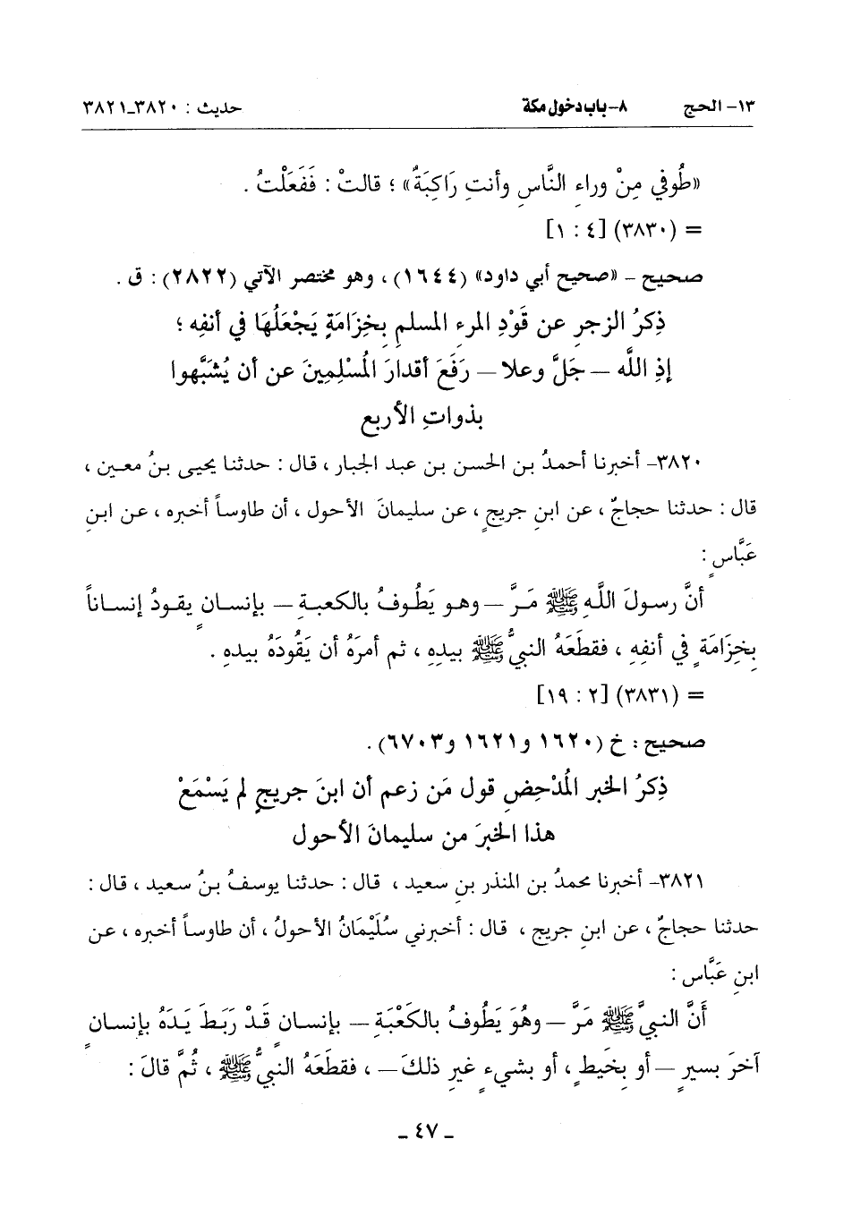 3821 - أَخْبَرَنَا مُحَمَّدُ بْنُ الْمُنْذِرِ بْنِ سَعِيدٍ قَالَ: حَدَّثَنَا يُوسُفُ بْنُ سَعِيدٍ قَالَ: حَدَّثَنَا حَجَّاجٌ عن ابن جريح قال: أخبرني سُلَيْمَانَ الْأَحْوَلِ أَنَّ طَاوُسًا أَخْبَرَهُ عَنِ ابْنِ عَبَّاسٍ:
