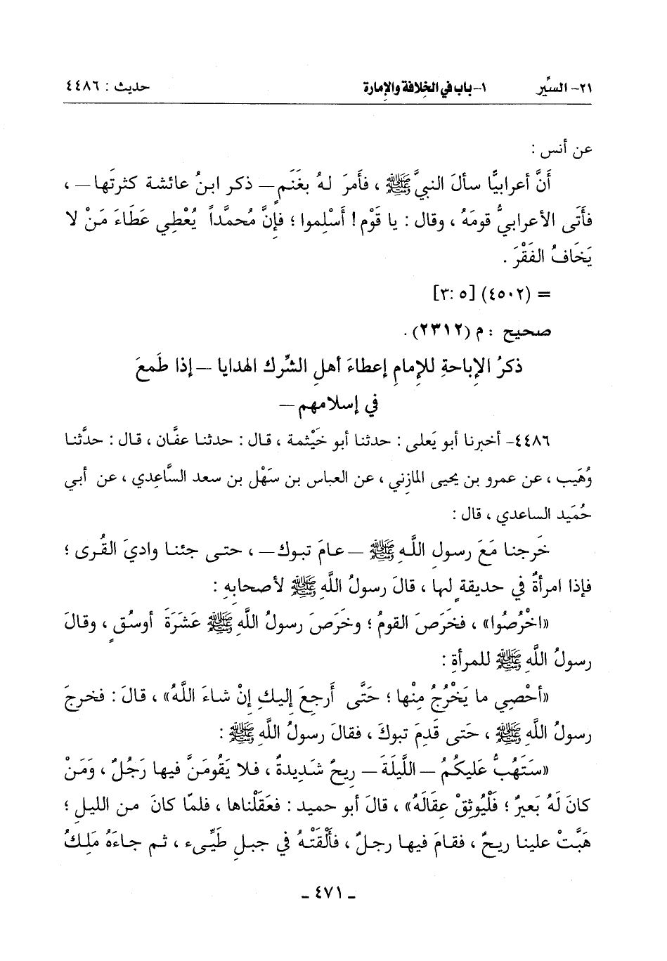 4486 - أَخْبَرَنَا أَبُو يَعْلَى حَدَّثَنَا أَبُو خَيْثَمَةَ قَالَ: حَدَّثَنَا عَفَّانُ قَالَ: حَدَّثَنَا وُهَيْبٌ عَنْ عَمْرِو بْنِ يَحْيَى الْمَازِنِيِّ عَنِ الْعَبَّاسِ بْنِ سَهْلِ بْنِ سَعْدٍ السَّاعِدِيِّ عَنْ أَبِي حُمَيْدٍ السَّاعِدِيِّ قَالَ: