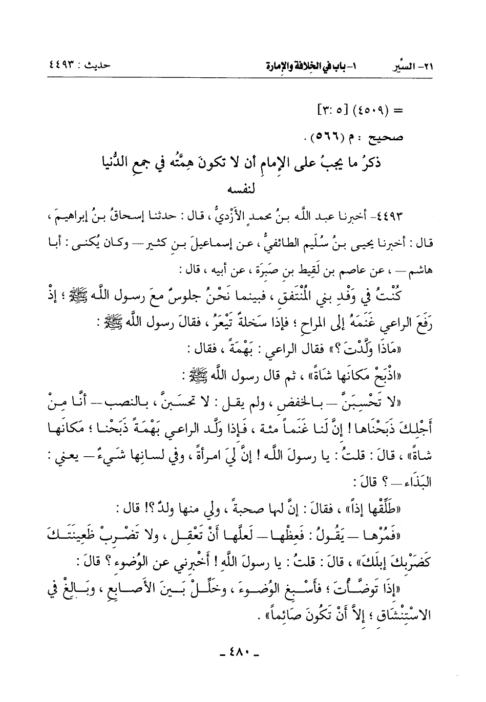 (لَا تَحْسِبَنَّ ـ بالخفضِ وَلَمْ يَقُلْ: لَا تحسَبنَّ بِالنَّصْبِ ـ أنَّا مِنْ أَجَلِكَ ذَبَحْنَاهَا إِنَّ لَنَا غَنَمًا مِئَةٌ فَإِذَا وَلَّد الرَّاعِي بَهْمَةً ذَبَحْنَا مَكَانَهَا شَاةً) قَالَ: قُلْتُ: يَا رَسُولَ اللَّهِ إِنَّ لِي امْرَأَةً وَفِي لِسَانِهَا شَيْءٌ ـ يَعْنِي الْبَذَاءَ ـ قَالَ: