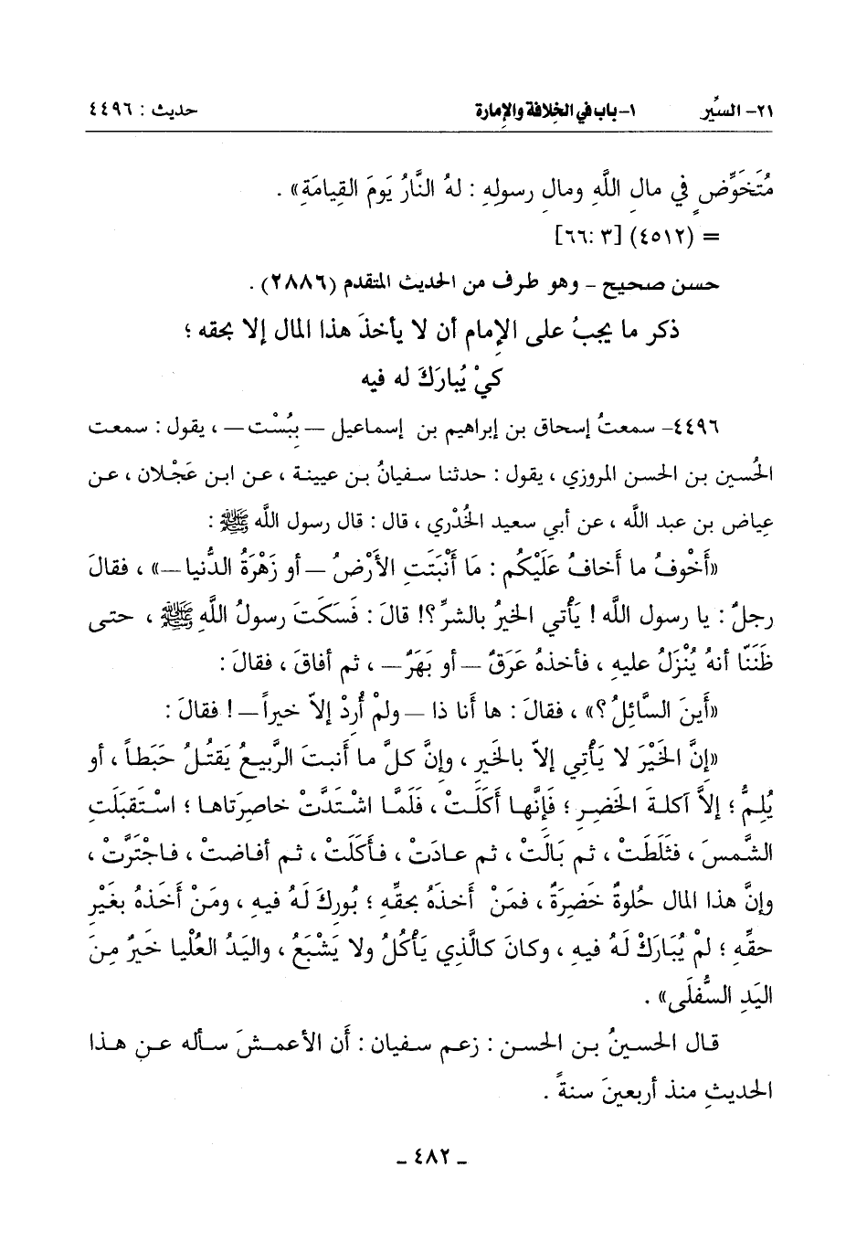 (إِنَّ الْخَيْرَ لَا يَأْتِي إِلَّا بِالْخَيْرِ وَإِنَّ كُلَّ مَا أَنَبْتَ الرَّبِيعُ يَقْتُلُ حَبَطًا أَوْ يُلِمُّ إِلَّا آكِلَةَ الْخَضِرِ فَإِنَّهَا أَكَلَتْ فَلَمَّا اشْتَدَّتْ خَاصِرَتَاهَا اسْتَقْبَلْتِ الشَّمْسَ فَثَلَطَتْ ثُمَّ بَالَتْ ثُمَّ عَادَتْ فَأَكَلْتُ ثُمَّ أَفَاضَتْ فاجترَّت وَإِنَّ هَذَا الْمَالَ حُلْوَةٌ خَضِرَةٌ فَمَنْ أَخَذَهُ بِحَقِّهِ بُورِكَ لَهُ فِيهِ وَمَنْ أَخَذَهُ بِغَيْرِ حَقِّهِ لَمْ يُبَارَكْ لَهُ فِيهِ وَكَانَ كَالَّذِي يَأْكُلُ وَلَا يَشْبَعُ وَالْيَدُ الْعُلْيَا خَيْرٌ مِنَ الْيَدِ السُّفْلَى)