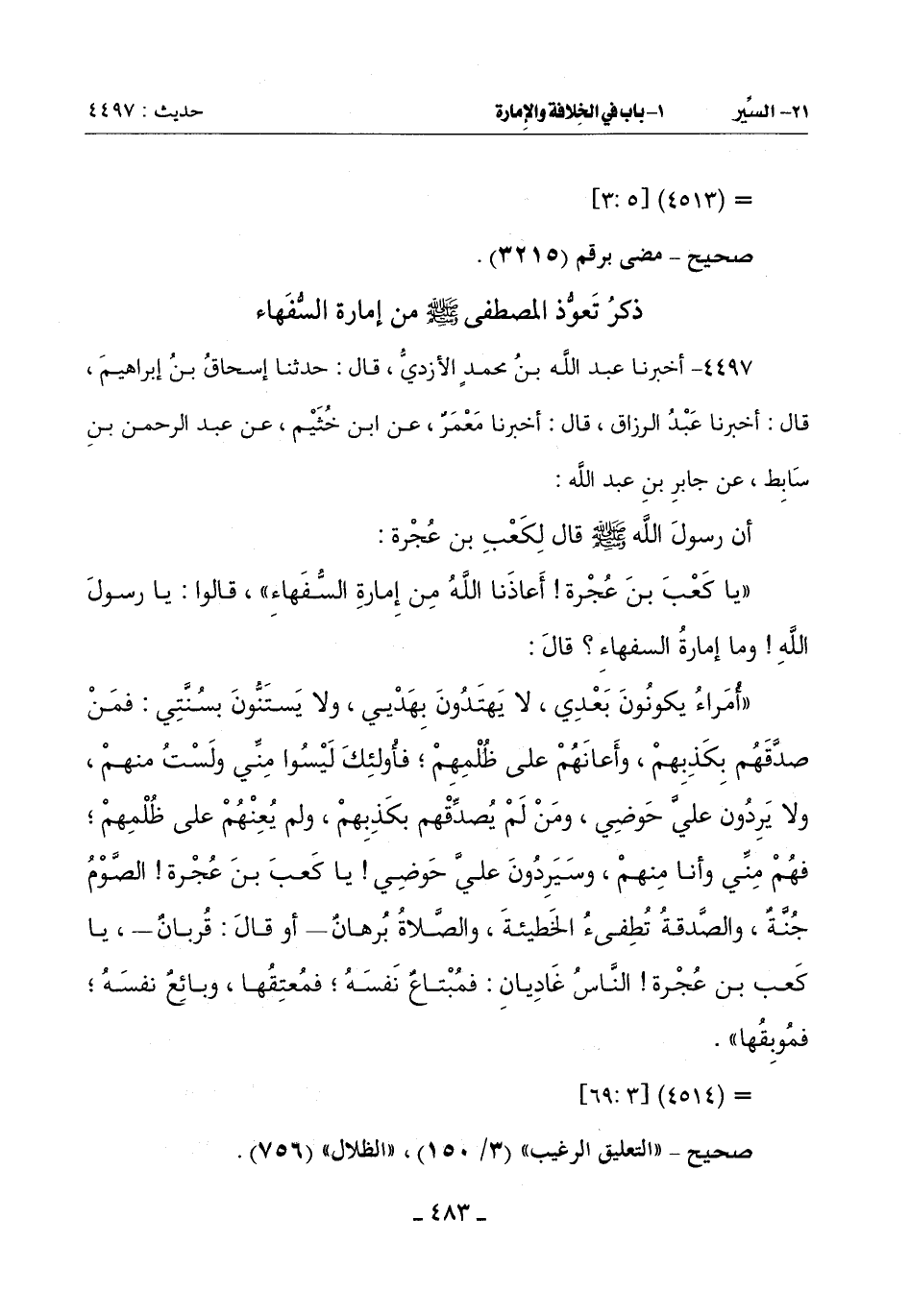 (يَا كَعْبَ بْنَ عُجْرَةَ أَعَاذَنَا اللَّهُ مِنْ إِمَارَةِ السُّفَهَاءِ) قَالُوا: يَا رَسُولَ اللَّهِ وَمَا إِمَارَةُ السُّفَهَاءِ؟ قَالَ: