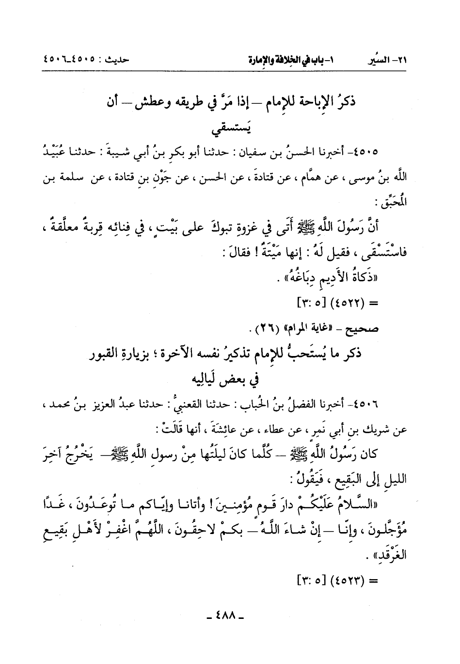 ذكرما يُسْتَحَبُّ لِلْإِمَامِ تَذْكِيرُ نَفْسِهِ الْآخِرَةَ بِزِيَارَةِ الْقُبُورِ فِي بَعْضِ لَيَالِيهِ
