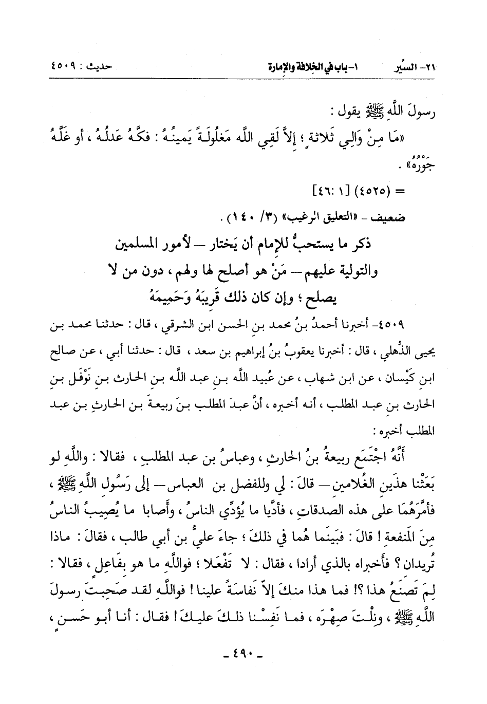 أَنَّهُ اجْتَمَعَ رَبِيعَةُ بْنُ الْحَارِثِ وَعَبَّاسُ بْنُ عَبْدِ الْمُطَّلِبِ فَقَالَا: وَاللَّهِ لَوْ بَعَثَنَا هَذَيْنِ الْغُلَامَيْنِ ـ قَالَ لِي وَلِلْفَضْلِ بْنِ الْعَبَّاسِ ـ إِلَى رَسُولِ اللَّهِ صَلَّى اللَّهُ عَلَيْهِ وَسَلَّمَ فَأَمَّرَهُمَا عَلَى هَذِهِ الصَّدَقَاتِ فأدَّيا مَا يُؤَدِّي النَّاسُ وَأَصَابَا مَا يُصِيبُ النَّاسُ مِنَ الْمَنْفَعَةِ قَالَ: فَبَيْنَمَا هُمَا فِي ذَلِكَ جَاءَ عَلِيُّ بْنُ أَبِي طَالِبٍ فَقَالَ: مَاذَا تُرِيدَانِ؟ فَأَخْبَرَاهُ بِالَّذِي أَرَادَا فَقَالَ: لَا تَفْعَلَا فَوَاللَّهِ مَا هُوَ بِفَاعِلٍ فَقَالَا: لِمَ تَصْنَعُ هَذَا؟! فَمَا هَذَا مِنْكَ إِلَّا نَفَاسَةٌ عَلَيْنَا! فَوَاللَّهِ لَقَدْ صَحِبْتَ رَسُولَ اللَّهِ صَلَّى اللَّهُ عَلَيْهِ وَسَلَّمَ وَنِلْتَ صِهْرَهُ فَمَا نَفِسْنَا ذَلِكَ عَلَيْكَ فَقَالَ: أَنَا أَبُو حسنٍ -[491]- أَرْسِلُوهُمَا ثُمَّ اضْطَجَعَ فَلَمَّا صَلَّى رَسُولُ اللَّهِ صَلَّى اللَّهُ عَلَيْهِ وَسَلَّمَ الظُّهْرَ سَبَقْنَاهُ إِلَى الْحُجْرَةِ فَقُمْنَا عِنْدَهَا حَتَّى مَرَّ بِنَا صَلَّى اللَّهُ عَلَيْهِ وَسَلَّمَ فَأَخَذَ بِآذَانِنَا وَقَالَ: