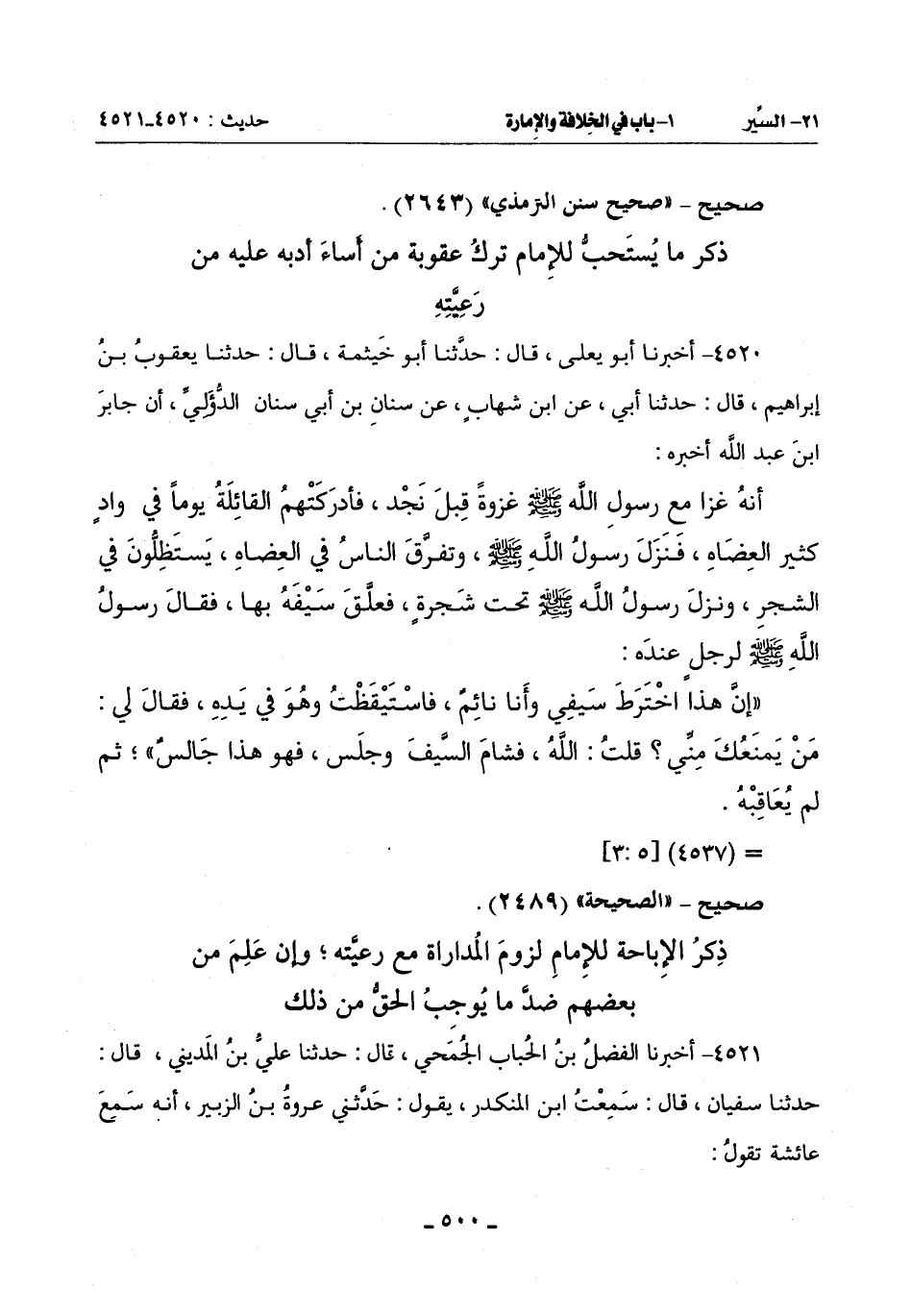 4521 - أَخْبَرَنَا الْفَضْلُ بْنُ الْحُبَابِ الْجُمَحِيُّ قَالَ: حَدَّثَنَا عَلِيُّ بْنُ الْمَدِينِيِّ قَالَ: حَدَّثَنَا سُفْيَانُ قَالَ: سَمِعْتُ ابْنَ الْمُنْكَدِرِ يَقُولُ: حَدَّثَنِي عُرْوَةُ بْنُ الزُّبَيْرِ أَنَّهُ سَمِعَ عَائِشَةَ تَقُولُ: -[501]-
