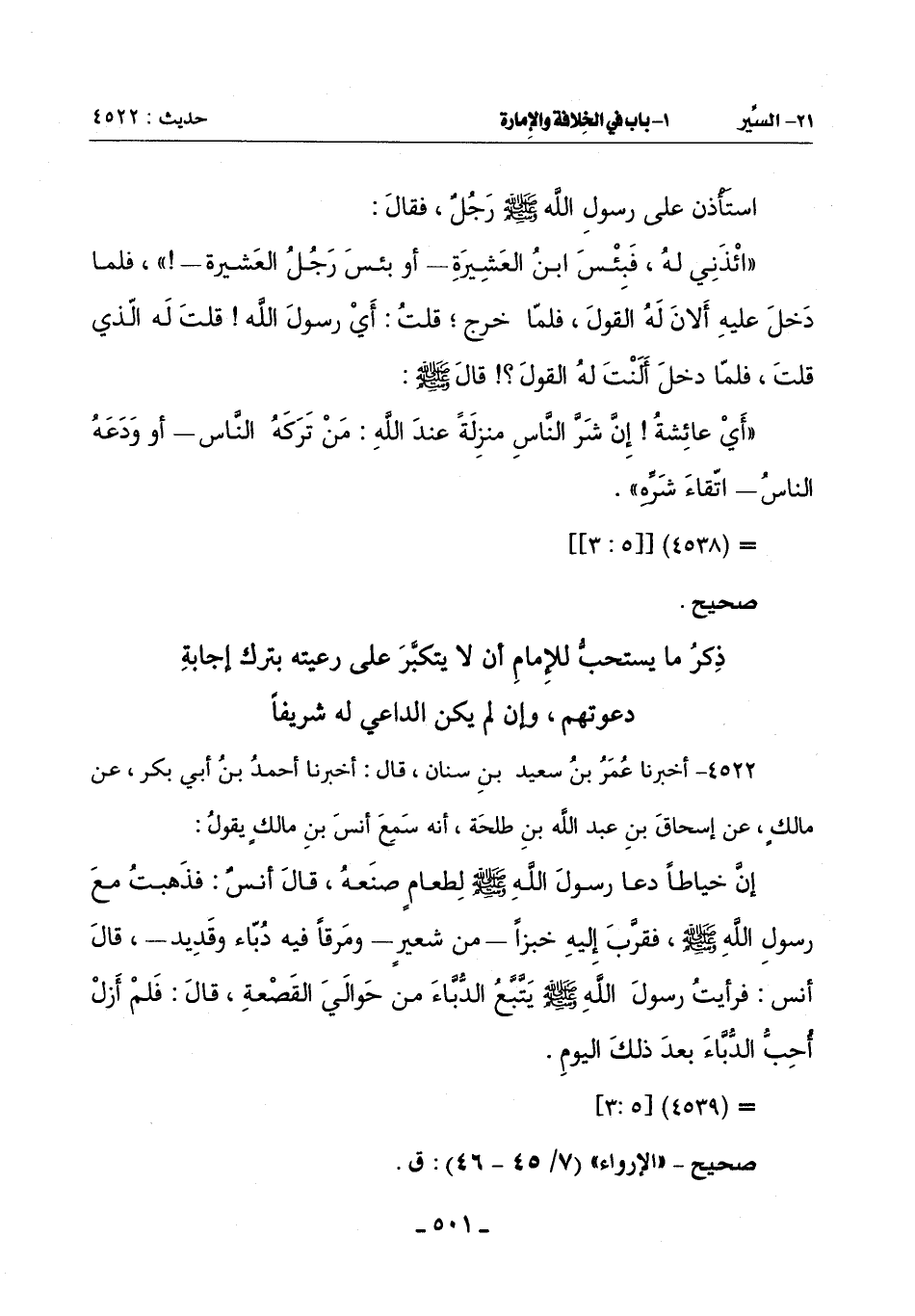 4522 - أَخْبَرَنَا عُمَرُ بْنُ سَعِيدِ بْنِ سِنَانٍ قَالَ: أَخْبَرَنَا أَحْمَدُ بْنُ أَبِي بَكْرٍ عَنْ مَالِكٍ عن إسحاق بن عبد الله بن طَلْحَةَ أَنَّهُ سَمِعَ أَنَسَ بْنَ مَالِكٍ يَقُولُ: