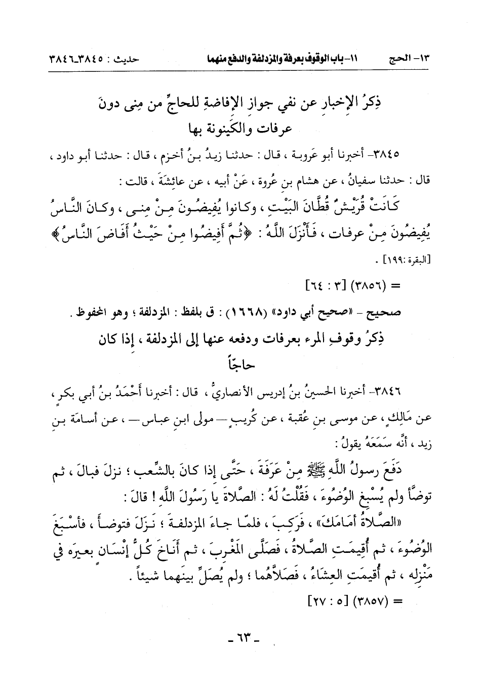 3845 - أَخْبَرَنَا أَبُو عَرُوبَةَ قَالَ: حَدَّثَنَا زَيْدُ بْنُ أَخْزَمَ قَالَ: حَدَّثَنَا أَبُو دَاوُدَ قَالَ: حَدَّثَنَا سُفْيَانُ عَنْ هِشَامِ بْنِ عُرْوَةَ عَنْ أبيه عَنْ عَائِشَةَ قَالَتْ: