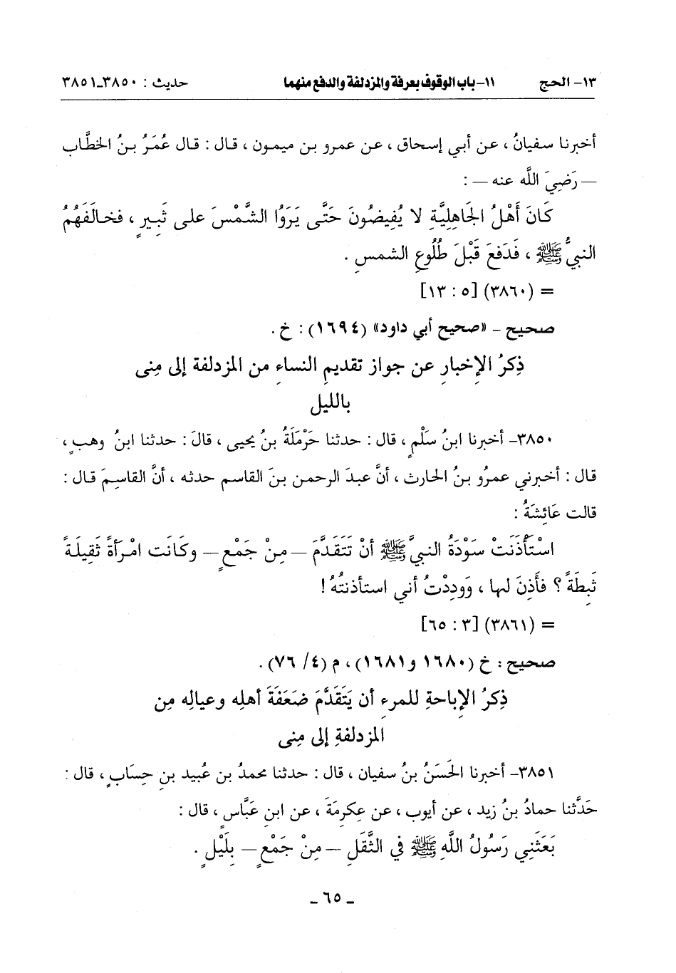 اسْتَأْذَنَتْ سَوْدَةُ النَّبِيِّ صَلَّى اللَّهُ عَلَيْهِ وَسَلَّمَ أَنْ تَتَقَدَّمَ مِنْ جَمْعٍ وَكَانَتِ امْرَأَةً ثَقِيلَةً ثبطة فأذن لها ووددت أني استأذنته