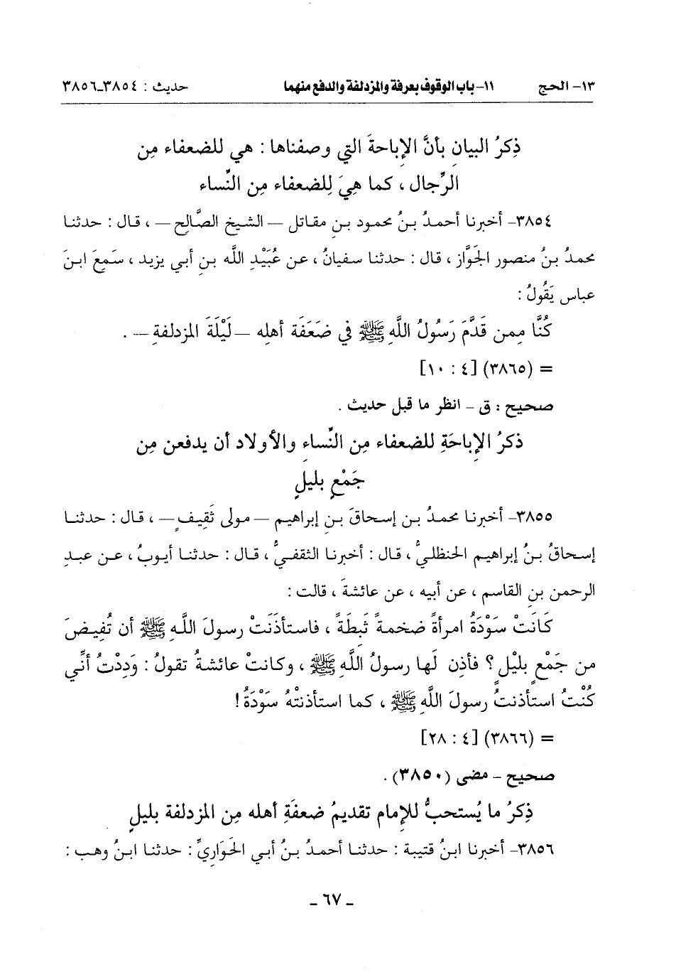ذِكْرُ مَا يُسْتَحَبُّ لِلْإِمَامِ تَقْدِيمُ ضَعَفَةِ أَهْلِهِ مِنَ الْمُزْدَلِفَةِ بِلَيْلٍ