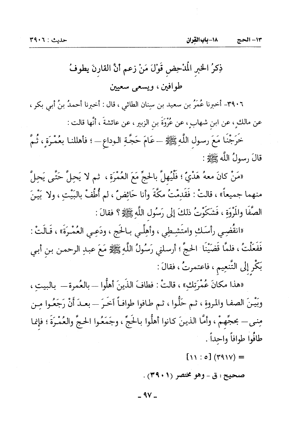 (مَنْ كَانَ مَعَهُ هَدْيٌ فَلْيُهِلَّ بِالْحَجِّ مَعَ الْعُمْرَةِ ثُمَّ لا يحل حتى يحل منهما جميعا) قالت: فَقَدِمْتُ مَكَّةَ وَأَنَا حَائِضٌ لَمْ أَطُفْ بِالْبَيْتِ وَلَا بَيْنَ الصَّفَا وَالْمَرْوَةِ فَشَكَوْتُ ذَلِكَ إِلَى رَسُولِ اللَّهِ صَلَّى اللَّهُ عَلَيْهِ وسلم فقال: