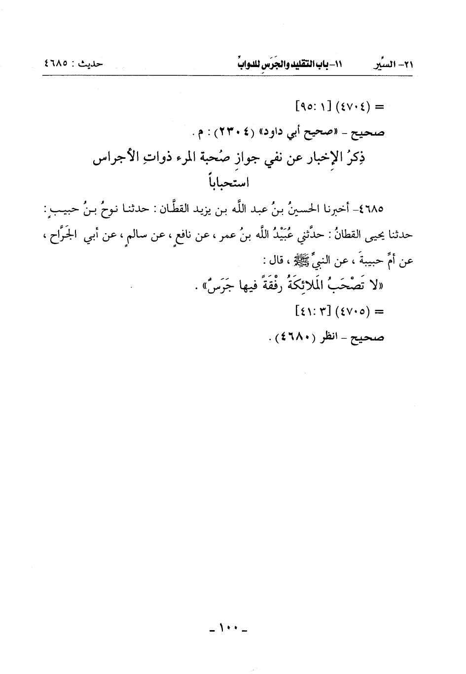 4685 - أَخْبَرَنَا الْحُسَيْنُ بْنُ عَبْدِ اللَّهِ بْنِ يَزِيدَ الْقَطَّانُ حَدَّثَنَا نُوحُ بْنُ حَبِيبٍ حَدَّثَنَا يَحْيَى الْقَطَّانُ حَدَّثَنِي عُبَيْدُ اللَّهِ بْنُ عُمَرَ عَنْ نَافِعٍ عَنْ سَالِمٍ عَنْ أَبِي الْجَرَّاحِ عَنْ أُمِّ حَبِيبَةَ عَنِ النَّبِيِّ صَلَّى اللَّهُ عَلَيْهِ وَسَلَّمَ قَالَ: