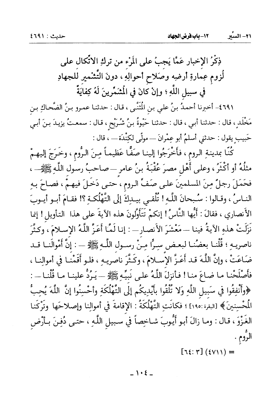 كُنَّا بِمَدِينَةِ الرُّومِ فَأَخْرَجُوا إِلَيْنَا صفَّاً عَظِيمًا مِنَ الرُّومِ وَخَرَجَ إِلَيْهِمْ مِثْلُهُ أَوْ أَكْثَرُ وَعَلَى أَهْلِ مِصْرَ عُقْبَةُ بْنُ عَامِرٍ صَاحِبُ رَسُولِ اللَّهِ صَلَّى اللَّهُ عَلَيْهِ وَسَلَّمَ فَحَمَلَ رَجُلٌ مِنَ الْمُسْلِمِينَ عَلَى صَفِّ الرُّومِ حَتَّى دَخَلَ فِيهِمْ فَصَاحَ بِهِ النَّاسُ وَقَالُوا: سُبْحَانَ اللَّهِ تُلْقِي بِيَدِكَ إِلَى التَّهْلُكَةِ؟ فَقَامَ أَبُو أَيُّوبَ الْأَنْصَارِيُّ فَقَالَ: أَيُّهَا النَّاسُ إِنَّكُمْ تَتَأَوَّلُونَ هَذِهِ الْآيَةَ عَلَى هَذَا التَّأْوِيلِ إِنَّمَا نَزَلَتْ هَذِهِ الْآيَةُ فِينَا مَعْشَرَ الْأَنْصَارِ إِنَّا لَمَّا أَعَزَّ اللَّهُ الْإِسْلَامَ وكثَّر نَاصِرِيهِ قُلْنَا بَعْضُنَا لِبَعْضٍ سِرًّا مِنْ رَسُولِ اللَّهِ صَلَّى اللَّهُ عَلَيْهِ وَسَلَّمَ: إِنَّ أَمْوَالَنَا قَدْ ضَاعَتْ وَإِنَّ اللَّهَ قَدْ أَعَزَّ الْإِسْلَامَ وكثَّر نَاصِرِيهِ فَلَوْ أَقَمْنَا فِي أَمْوَالِنَا فَأَصْلَحْنَا مَا ضَاعَ مِنَّا فَأَنْزَلَ اللَّهُ عَلَى نَبِيِّهِ صَلَّى اللَّهُ عَلَيْهِ وَسَلَّمَ ـ يَرُدُّ عَلَيْنَا مَا قُلْنَا ـ: {وَأَنْفِقُوا فِي سَبِيلِ اللَّهِ وَلَا تُلْقُوا بِأَيْدِيكُمْ إِلَى التَّهْلُكَةِ وَأَحْسِنُوا إِنَّ اللَّهَ يُحِبُّ الْمُحْسِنِينَ} [البقرة: 195] فَكَانَتِ التَّهْلُكَةُ الْإِقَامَةَ فِي أَمْوَالِنَا وَإِصْلَاحَهَا وَتَرْكَنَا الْغَزْوَ قَالَ: وَمَا زَالَ أَبُو أَيُّوبَ شَاخِصًا فِي سبيل الله حتى دفن بأرض الروم