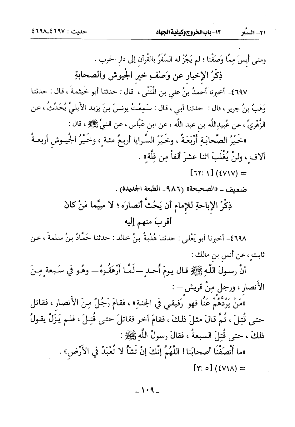 (خَيْرُ الصَّحَابَةِ أَرْبَعَةٌ وَخَيْرُ السَّرَايَا أَرْبَعُ مئة وَخَيْرُ الْجُيُوشِ أَرْبَعَةُ آلَافٍ وَلَنْ يُغْلَبَ اثْنَا عشر ألفاً من قِلَّةٍ)