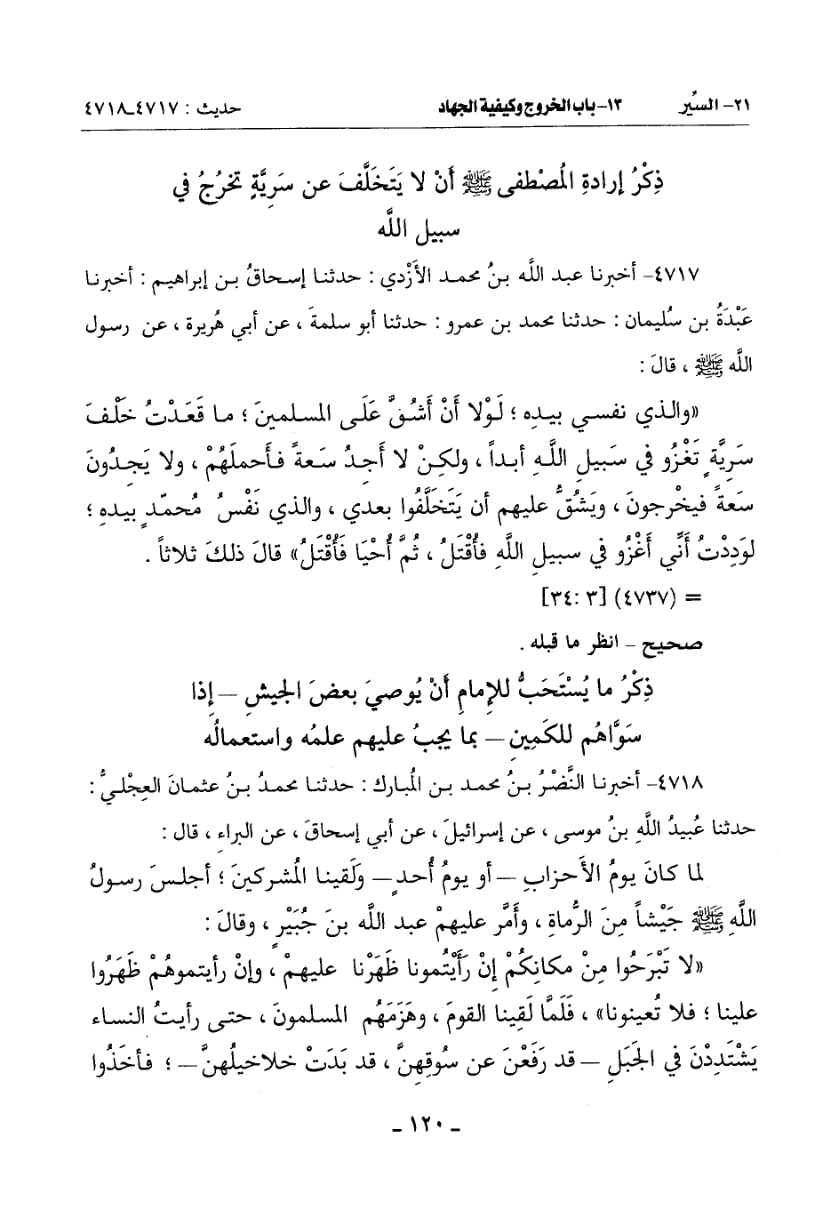 (وَالَّذِي نَفْسِي بِيَدِهِ لَوْلَا أَنْ أَشُقَّ عَلَى الْمُسْلِمِينَ مَا قعدتُ خَلْفَ سَرِيَّةٍ تَغْزُو فِي سَبِيلِ اللَّهِ أَبَدًا وَلَكِنْ لَا أَجِدُ سَعَةً فَأَحْمِلُهُمْ وَلَا يَجِدُونَ سَعَةً فَيَخْرُجُونَ وَيَشُقُّ عَلَيْهِمْ أَنْ يَتَخَلَّفُوا بَعْدِي وَالَّذِي نَفْسُ مُحَمَّدٍ بِيَدِهِ لوَدِدْتُ أَنِّي أَغْزُو فِي سَبِيلِ اللَّهِ فأُقْتَلُ ثُمَّ أُحْيَا فَأُقْتَلُ) قال ذلك ثلاثاً.